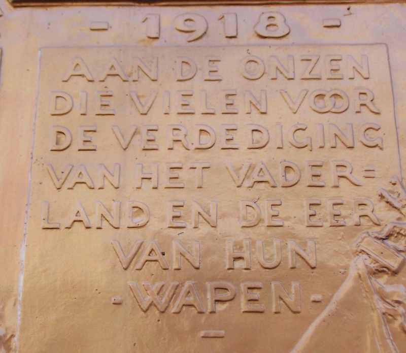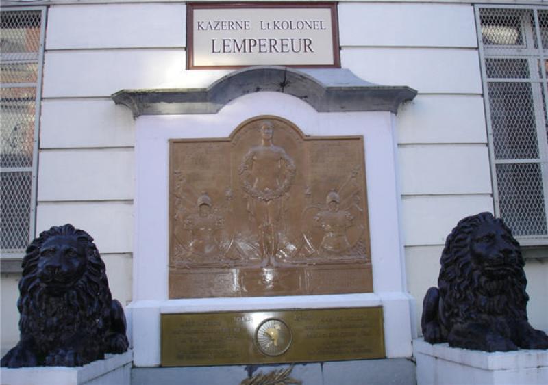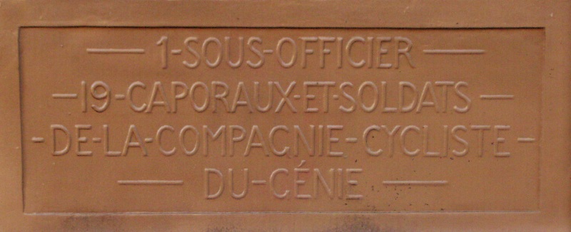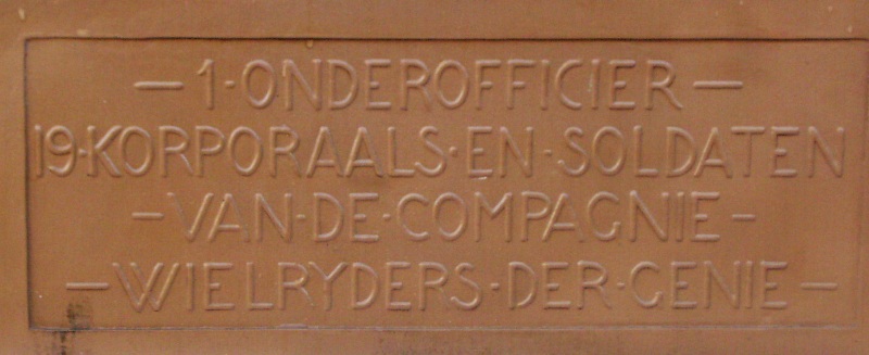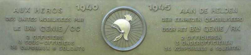 Situering: Kazerne Lt Kolonel LEMPEREUR, Brusselsesteenweg, tegenover nr 41. GPS-coördinaten: 50°49'28.21" N, 4°30'36.37 "E. Opschriften "1914 _ 1918 AUX NÔTRES TOMBÉS POUR LA DÉFENSE DE LA PATRIE ET L'HONNEUR DE LEUR ARME AAN DE ONZEN DIE VIELEN VOOR DE VERDEDIGING VAN HET VADER- LAND EN DE EER VAN HUN WAPEN 1 SOUS-OFFICIER 19 CAPORAUX ET SOLDATS DE LA COMPAGNIE CYCLISTE DU GÉNIE 1 ONDEROFFICIER 19 KORPORAALS EN SOLDATEN VAN DE COMPAGNIE WIELRYDERS DER GENIE 1940 - 1945 AUX HÉROS DES UNITÉS MOBILISÉES PAR LE BON GÉNIE / CC 2 OFFICIERS 3 SOUS-OFFICIERS 34 CAPORAUX ET SOLDATS AAN DE HELDEN DER EENHEDEN GEMOBILISEERD DOOR HET BON GENIE / RK 2 OFFICIEREN 3 ONDEROFFICIEREN 34 KORPORAALS EN SOLDATEN Meer foto's van het monument - Meer foto's van deze monument - Foto's van de opknapwerken in 2005 Ce monument ne comporte pas de noms - Op deze monument zijn geen namen gebeiteld |
