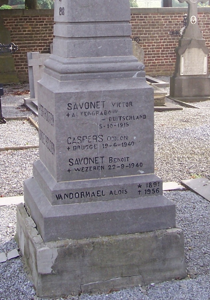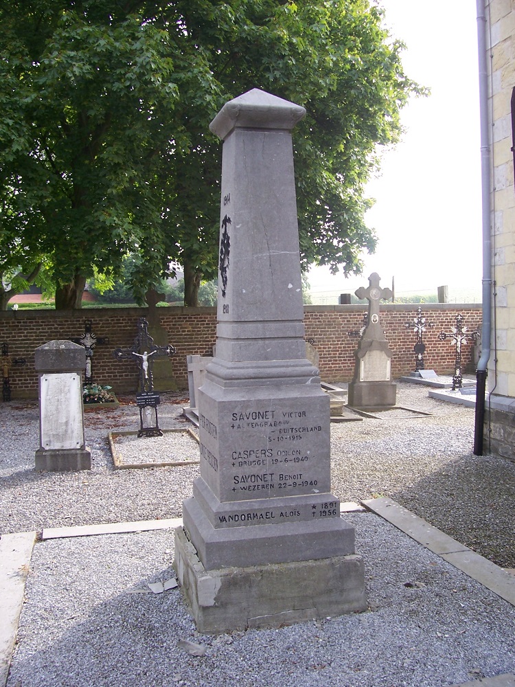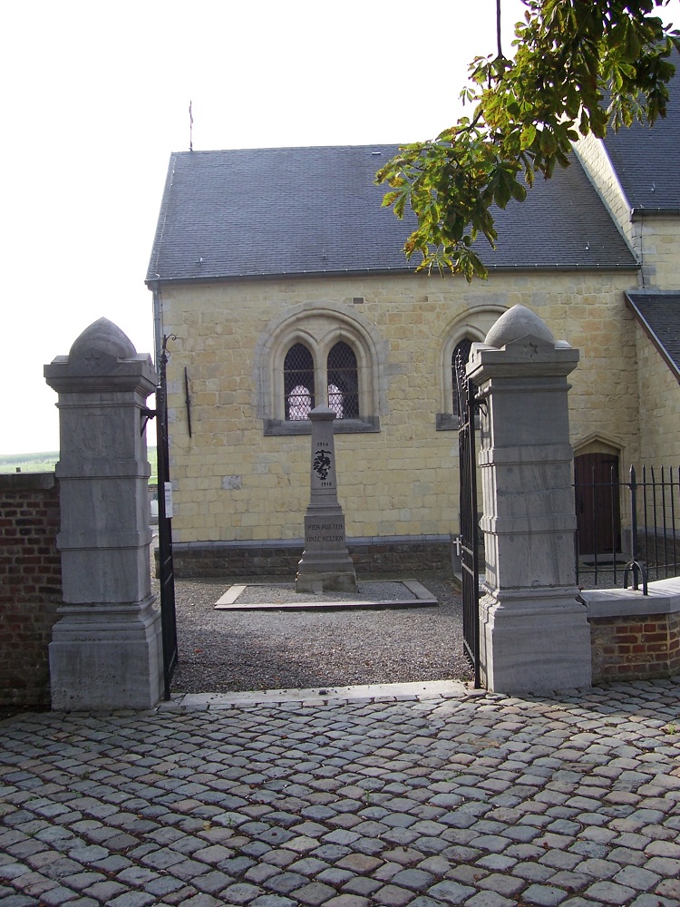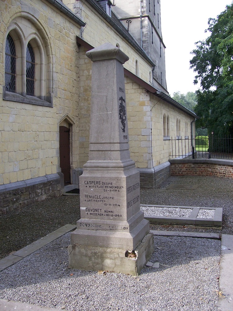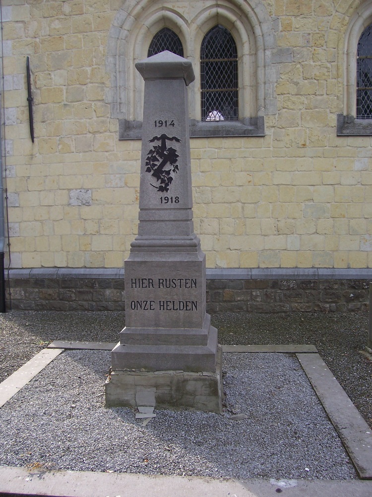 Ligging: Op kerkhof, nabij Sint-Amanduskerk, Wezerenstraat. GPS-coördinaten: +50°43'44.64", +5°06'17.07". Opschriften Voorkant "1914 / 1918 HIER RUSTEN ONZE HELDEN" Linkerkant "[Vier namen, gerangschikt volgens overlijdensdatum, met vermelding van overlijdensdatum en -plaats voor drie gesneuvelden en geboorte- en overlijdensjaar voor een oudstrijder]" Rechterkant "[Vier namen, gerangschikt volgens overlijdensdatum, met vermelding van overlijdensdatum en -plaats voor drie gesneuvelden en geboorte- en overlijdensjaar voor een oudstrijder]" Zie namen op het gedenkteken |