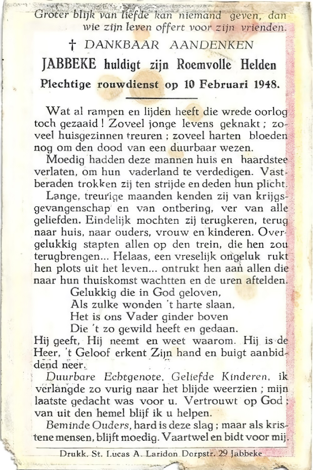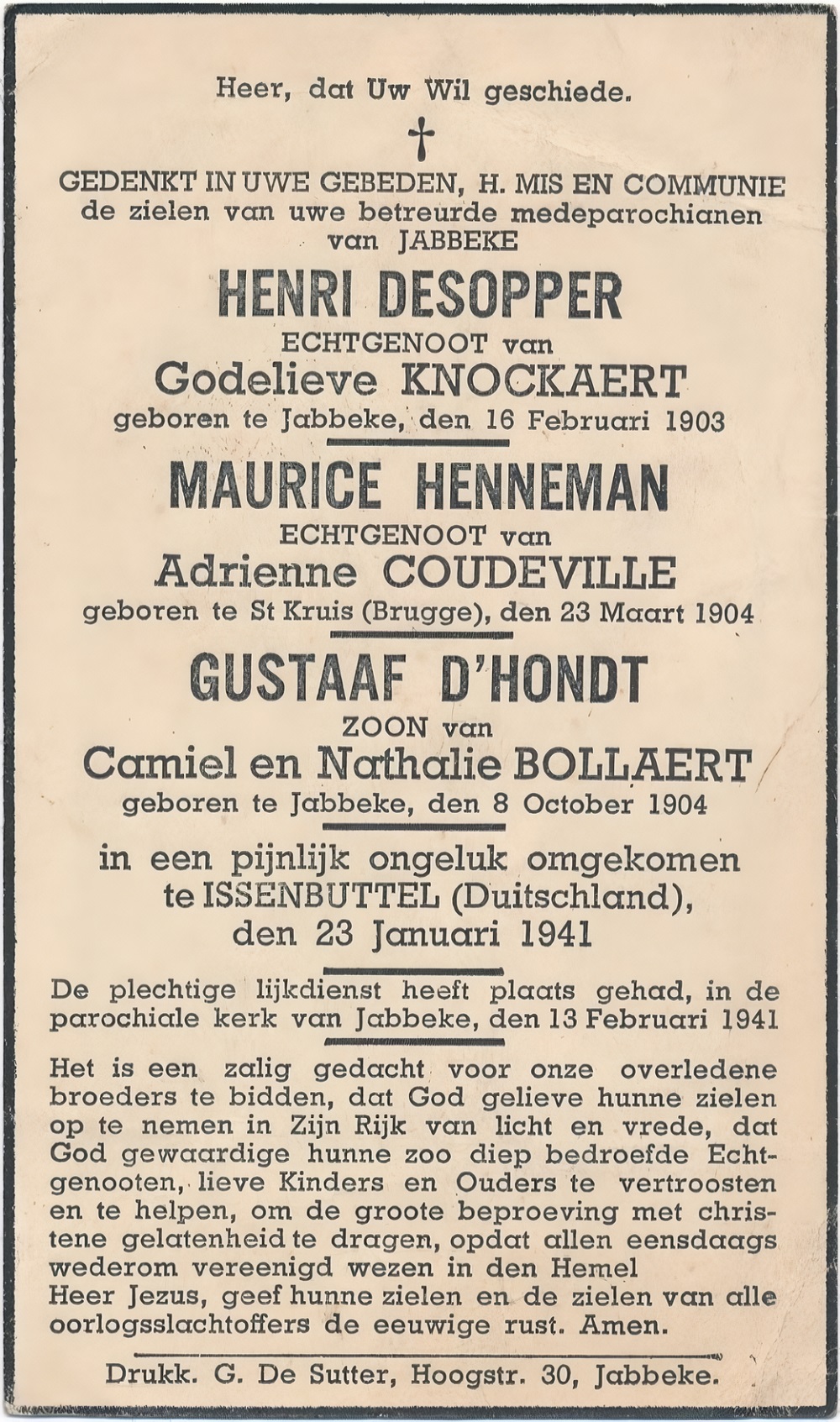 Ligging: Privéverzameling. Opschriften "BEVOLKING VAN JABBEKE GEDENKT UW KRIJGSGEVANGEN VERONGELUKT IN DIENST VAN HET VADERLAND [Drie namen, alfabetisch gerangschikt, met foto en verschillende biografische inlichtingen] IN EEN PIJNLIJK ONGELUK OMGEKOMEN TE ISSENBUTTEL (DUITSCHLAND) DEN 23 JANUARI 1941." "HEER, DAT UW WIL GESCHIEDE. GEDENKT IN UWE GEBEDEN, H. MIS EN COMMUNIE DE ZIELEN VAN UWE BETREURDE MEDEPAROCHIANEN VAN JABBEKE [Drie namen, naar geboortedatum gerangschikt, met foto en verschillende biografische inlichtingen] [Zie ook scan onderaan]" "GROTER BLIJK VAN LIEFDE KAN NIEMAND GEVEN, DAN WIE ZIJN LEVEN OFFERT VOOR ZIJN VRIENDEN DANKBAAR AANDEKEN JABBEKE HULDIGT ZIJN ROEMVOLLE HELDEN PLECHTIGE ROUWDIENST OP 10 FEBRUARI 1948. [Zie ook scan onderaan]" Bijkomende informatie Voor bijkomende informatie over het treinongeval te Isenbüttel (Duitsland): Hét ABL-History Forum. Zie namen op de documenten |