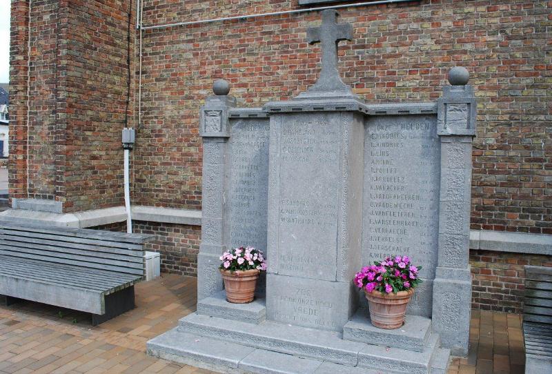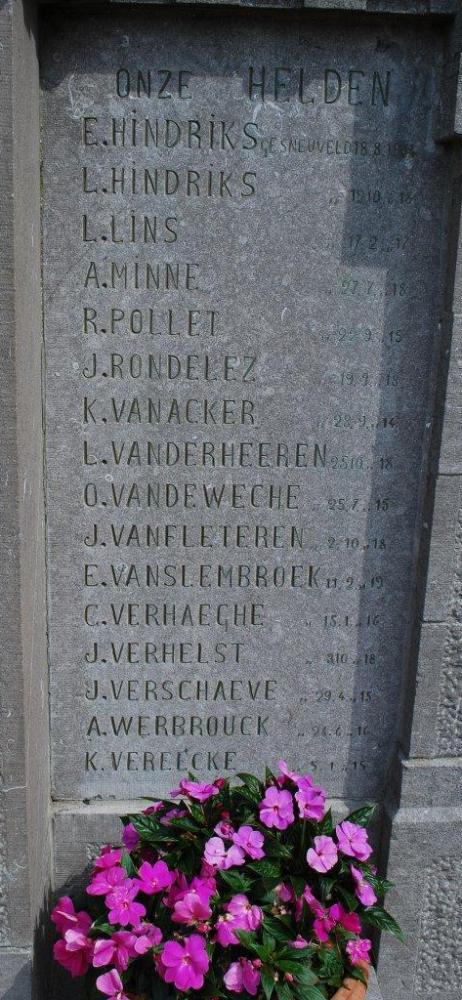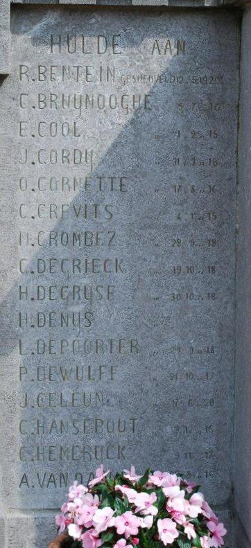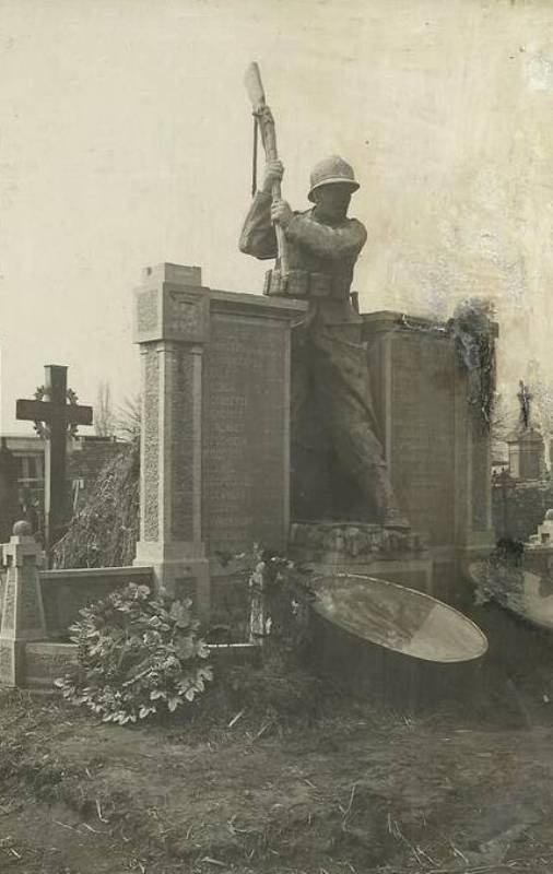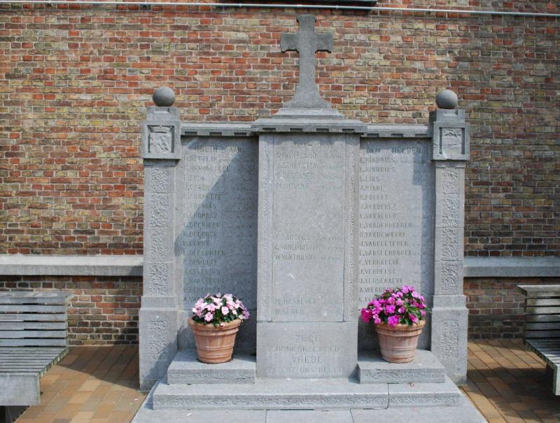 Er liggen talrijke bloemen voor het oorlogsmonument dat toen