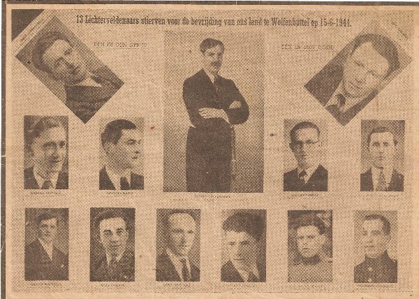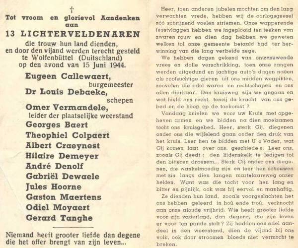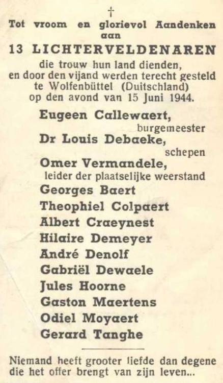 Situering van de graftombe: Gemeentelijke begraafplaats, Boomgaardstraat. GPS-coördinaten: +51° 1' 45.54", +3° 8' 32.68". Opschriften op de graftombe "ÉÉN IN DEN STRYD - ÉÉN IN DEN DOOD DE WEERSTAND VAN LICHTERVELDE ONTHOOFD TE WOLFENBÜTTEL 15 JUNI 1944 [De namen van de slachtoffers staan zowel in de opstaande plaat , als op voorzijde van de graftombe aangegeven, maar op de opstaande plaat staan veertien namen en op de voorzijde van de graftombe alleen maar dertien. De namen zijn niet alfabetisch gerangschikt. Uitgehouwen letters] UIT DANKBAARHEID VOOR VRIENDSCHAP EN VREDE GEDENKDAG 17 JUNI 2000 N.A.V. 70 JAAR N.S.B." Beschrijving Een zeer grote rechthoekige graftombe uit hardsteen, met een in de grafplaat uitgehouwen kruis en achteraan een rechtopstaande plaat. Uitvoering: A. TANGHE, Lichtervelde (gesigneerd) (Bron [46]) Geschiedenis Een van de eerste vergaderingen van het Lichterveldse verzet vond plaats in december 1941 in het zaaltje achter de herberg de Posterij, nu drukkerij Verma. Reserve-officier VANDERHAEGHEN uit Roeselare had de opdracht een contingent van zeshonderd weerstanders te vormen in de regio Roeselare, om een eventuele landing van Amerikaanse en Engelse troepen aan de Belgische kust te ondersteunen. Wapens waren voor verzetsbewegingen een belangrijk middel en dit zou de verzetsgroep in de problemen brengen. Leden van de weerstand in bezet gebied die een wapen hadden, kregen de doodstraf. In september 1942 werd de verzetsgroep ontmaskerd. Veertig mensen werden aangehouden, anderen doken onder, sommigen ontsnapten maar dertien van hen zouden nooit meer levend terugkeren (Bron: Het Nieuwsblad, 17 juni 2004) Zie namen gebeiteld op het monument |