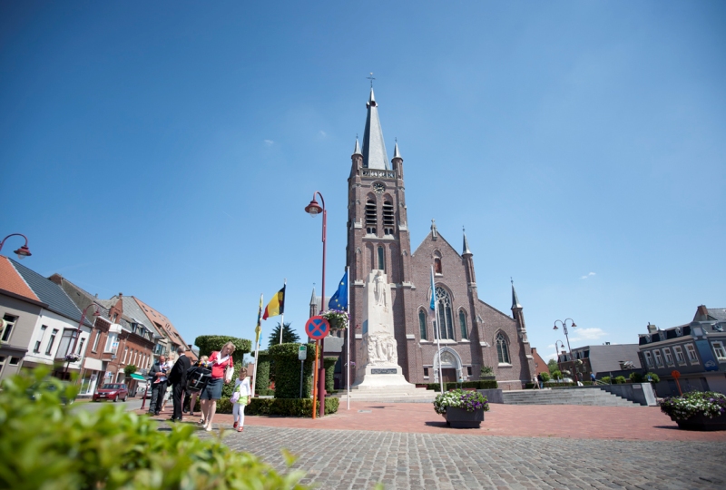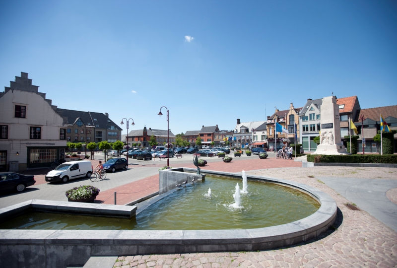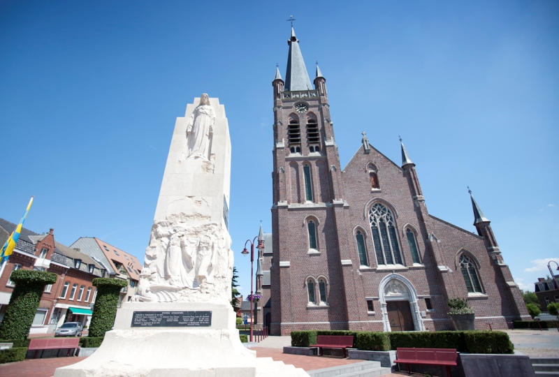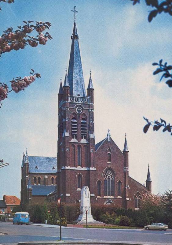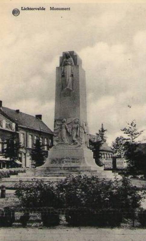 Situering van het monument: Kerkplein, voor de Sint-Jacobuskerk. GPS-coördinaten: +51°1'38.30", +3°8'29.59" Opschriften op het monument Voorkant "POLITIEKE GEVANGENEN ONTHOOFD TE WOLFENBÜTTEL 15-06-1944 [Dertien namen] ONTHOOFD TE DORTMUND 18-10-1943 [Één naam] OMGEKOMEN TE BUCHENWALD 05-01-1945 [Één naam]" Rechterkant "SOLDATEN 1914 - 1918 [Veertig namen, alfabetisch gerangschikt] SOLDATEN 1940 - 1945 [Vijf namen, alfabetisch gerangschikt]" Linkerkant "BURGERLIJKE SLACHTOFFERS 1914 - 1918 1940 - 1945 [Twee-en-veertig namen, alfabetisch gerangschikt] [Vijf namen, alfabetisch gerangschikt] [Elf namen, alfabetisch gerangschikt]" Achterkant "UIT HELDENTROUW WERD 'T VADERLAND HERBOREN UIT DANKBAARHEID, VOOR VRIENDSCHAP EN VREDE GEDENKDAG 17 JUNI 2000 N.A.V. 70 JAAR N.S.B." Beschrijving Op een platform met vier treden staat een geprofileerde sokkel met concave buiging. Hierop is een vierkante zuil geplaatst die trapvormig versmalt bovenaan, onderaan versierd met doorlopende gebeeldhouwde fries met de volgende taferelen: op de voorkant een overwinningsgodin met wapperende mantel, die een dode man bij de hand neemt. In de andere hand houdt zij een palmtak. Op de voorgrond liegt een fantastisch dier, een soort gevleugelde leeuw met een vissestaart. Op de rechterkant biedt een klein meisje, vastgehouden door de moeder (in lang gewaad en het haar in een wrong), een bloemruiker aan een vliegenier. Op de linkerkant stappen twee vliegeniers vooruit. De voorste draagt het vandeel, de achterste het geweer in aanslag. Aan de voorkant bobenaan is een H. Hartbeeld in hoogreliëf geplaatst. Uitvoering: ALLAERT, Kortrijk (architect, ontwerper); G. DELAFONTAINE, Menen (beeldhouwer); V. DUYVEWAERT, Roeselare (plaatsing). Onthulling: De onthulling had plaats op 12 september 1948 door minister DE MAN. De eigenlijke onthulling van het gedenkteken werd gedaan door het jongste kind van dokter DEBAEKE, de laatste terechtgestelde in Wolfenbüttel (Bron [46]) Zie namen vermeld op het monument |