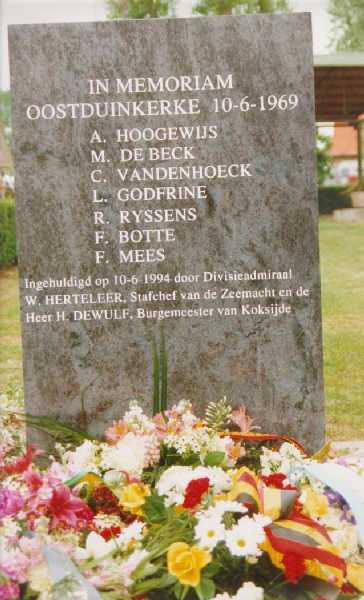 Situering van het monument: Vakantiecentrum "Het Vissershuis", Westhinderstraat, 13. De gedenkplaat bevindt zich rechts van de oprijlaan naar de parking van het vakantiedomein. GPS-coördinaten: 51° 06' 41" N - 02° 40' 14" E. Opschrift op het gedenksteen "IN MEMORIAM OOSTDUINKERKE 10-6-1969 [Zeven namen] INGEHULDIGD OP 10-6-1994 DOOR DIVISIEADMIRAAL W. HERTELEER, STAFCHEF. VAN DE ZEEMACHT EN DE HEER H. DEWULF, BURGEMEESTER VAN KOKSIJDE" Geschiedenis Bij het ontmijnen van een oude vliegtuigbom op deze plaats kwamen op 10 juni 1969 zeven mensen van de ontmijningsdienst van de Belgische Landmacht om het leven. Precies 25 jaar later, op 20 juni 1994 werd een arduinen gedenkplaat onthuld voor hun nagedachtenis. Ook vandaag nog eisen beide wereldoorlogen hun tol (Bron: http://inwoner.koksijde.be/). Opschrift op de herinneringsplaat "HERINNERING AAN ONTMIJNINGSONGEVAL VAKANTIECENTRUM VISSERSHUIS [Zeven namen, niet alfabetisch gerangschickt, met geboortedatum en foto] BIJ HET ONTMIJNEN VAN EEN OUDE VLIEGTUIGBOM KWAMEN OP 10 JUNI 1969 ZEVEN MENSEN VAN DE ONTMIJNINGSDIENST VAN DE BELGISCHE ZEEMACHT OM HET LEVEN. BIJ DE VEERTIGSTE VERJAARDAG OP 10 JUNI 2009 WERD TER ATTENTIE VAN DE ZORGELOZE VOORBIJGANGERS EEN HERINNERINGSPLAAT ONTHULD DOOR BURGEMEESTER MARC VANDEN BUSSCHE IN AANWEZIGHEID VAN Z.K.H. PRINS LAURENT. ONZE BIJZONDERE DANK EN WAARDERING GAAN UIT NAAR DEZE MENSEN DIE ZICH MET MOED EN ZELFOPOFFERING HEBBEN INGEZET VOOR HET WELZIJN VAN ONS VADERLAND. NOUS TENONS À REMERCIER SINCÈREMENT CES