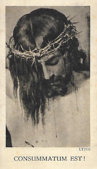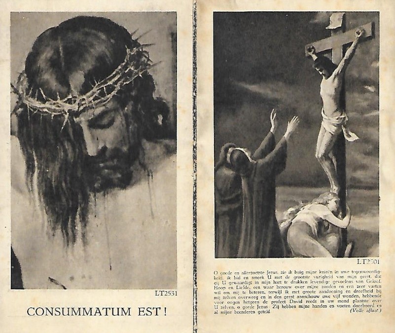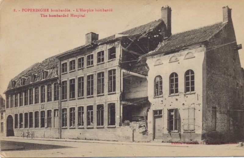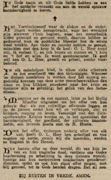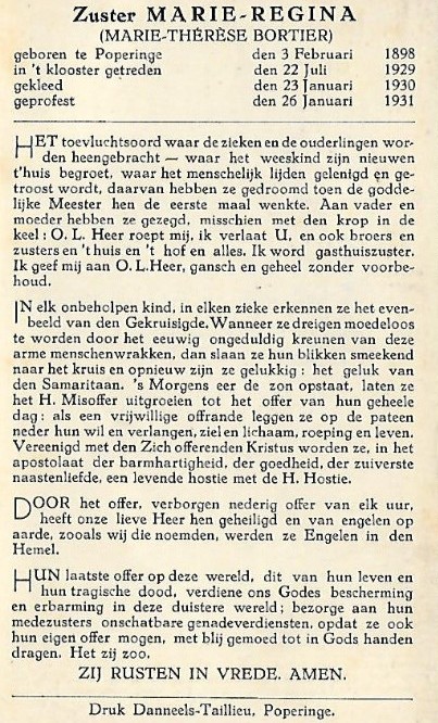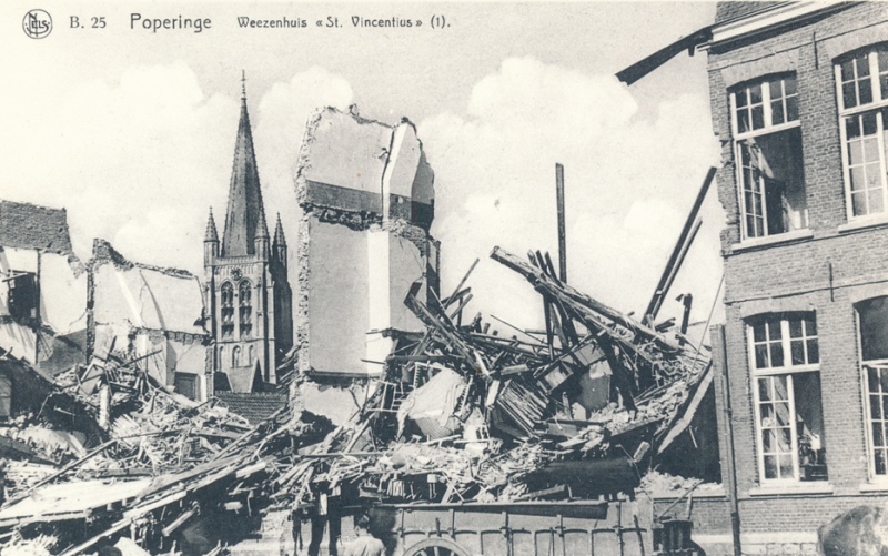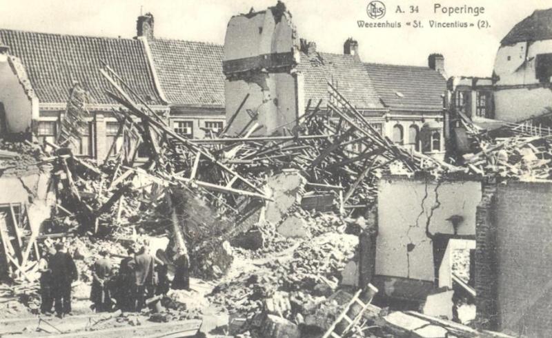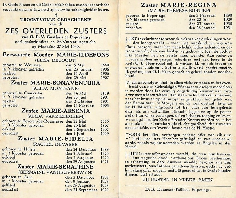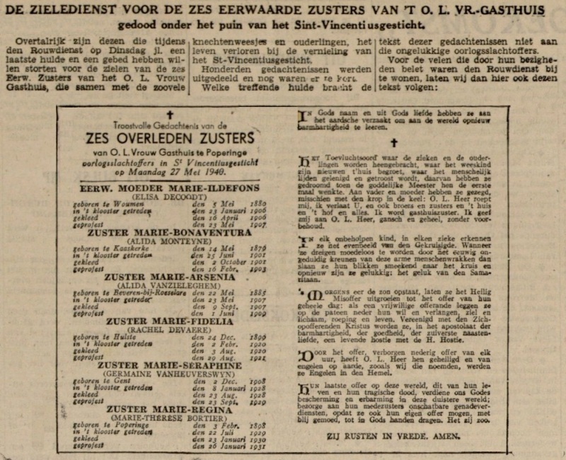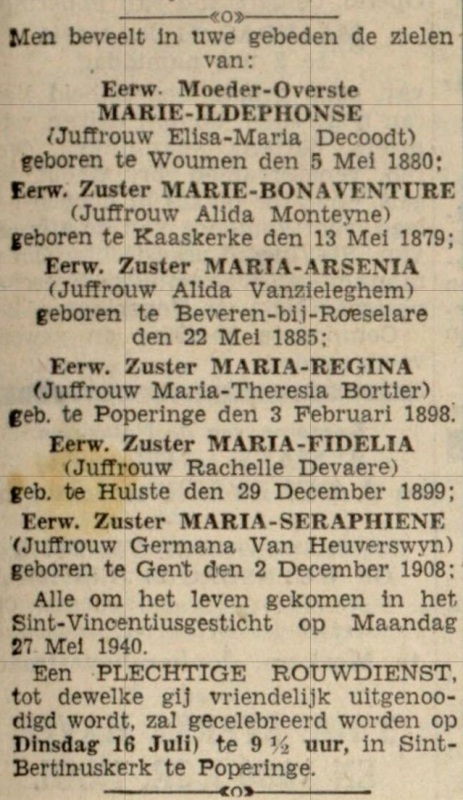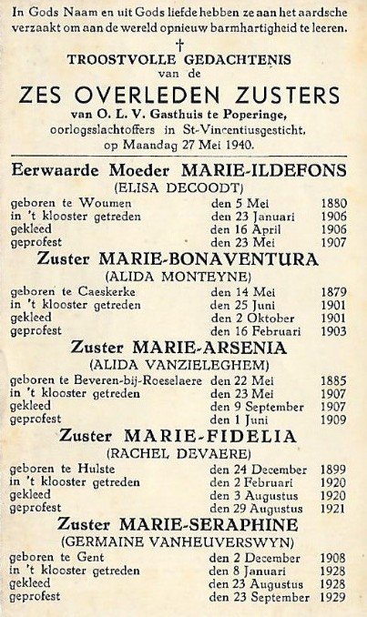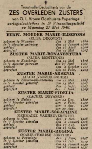 Ligging: Bidprent: Privatécollectie. Rouwprenten: Bron [293]. Opschriften Bidprent "TROOSTVOLLE GEDACHTENIS VAN DE ZES OVERLEDEN ZUSTERS VAN O.L.V. GASTHUIS OORLOGSSLACHTOFFERS IN ST-VINCENTIUSGESTICHT, OP MAANDAG 27 MEI 1940 [Zes namen, niet alfabetisch gerangschikt, met verschillende informaties] [Zie ook scans onderaan]" Rouwprent "MEN BEVEELT IN UWE GEBEDEN DE ZIELEN VAN" [Zes namen, niet alfabetisch gerangschikt, met vermelding van geboorteplaats en -datum] ALLE OM HET LEVEN GEKOMEN IN HET SINT-VINCENTIUSGESTICHT OP MAANDAG 27 MEI 1940. [Zie ook scan onderaan]" Beschrijving Het wezenhuis "Sint-Vincentius" stond op het huidige Oudstrijdersplein en werd vernield op 27 mei 1940 door een luchtbombardement (Bron [220]) en kostte an 49 mensen het leven (6 zusters, 30 weesjes en 13 ouderlingen en burgers. Het gesticht werd niet wederopgebouwd (Bronnen: [100], [220] en "De Poperinghenaar", 16 juni 1940 (Bron [293]). Zie namen vermeld op de documenten |
