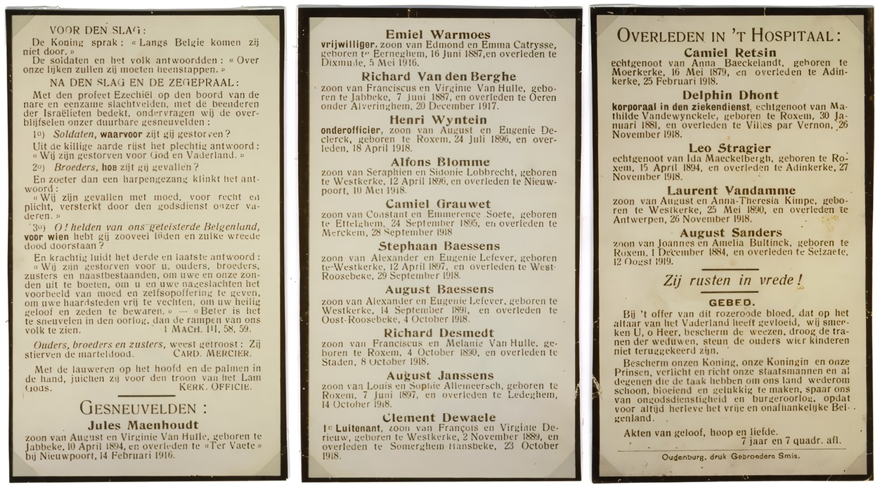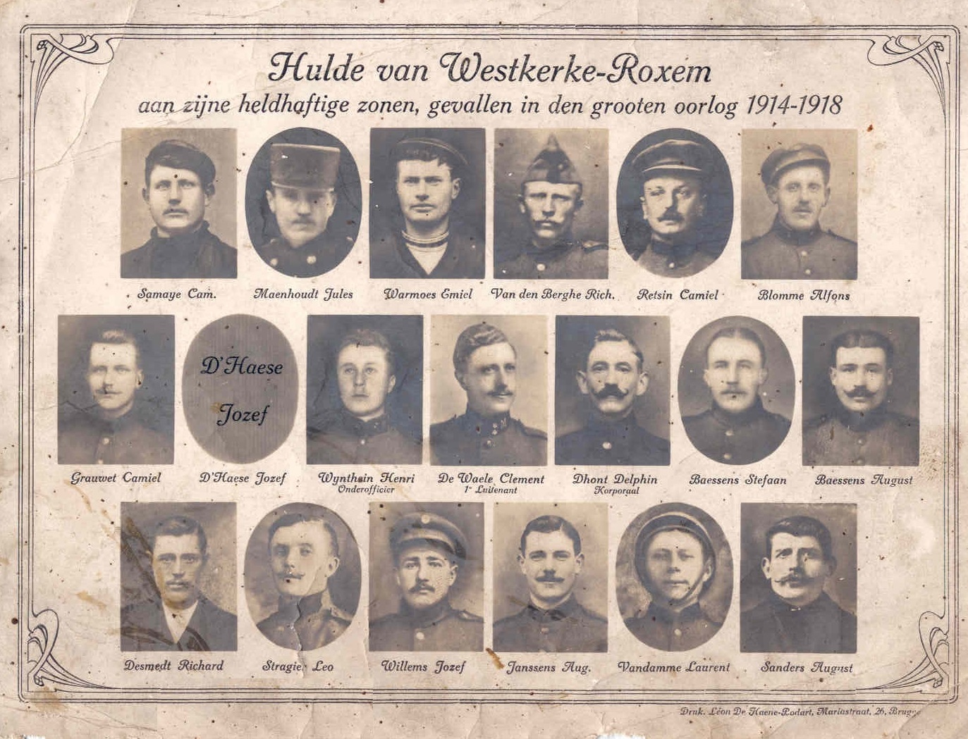 Ligging: Bron [65]. Opschriften op het document Memento 1 "HULDE VAN WESTKERKE-ROXEM AAN ZIJNE HELDHAFTIGE ZONEN, GEVALLEN IN DEN GROOTEN OORLOG 1914-1918 [Negentien namen, niet alfabetisch gerangschikt, met foto's voor achttien slachtoffers]" Memento 2 "[Zie scans onderaan]" Zie namen op de documenten |
