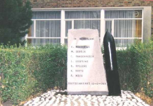 Situering van het monument: Marinecomponent, Marinebasis Zeebrugge, Graaf Jansdijk 1. GPS-Coördinaten: 51° 20' 10" N - 03° 12' 33" E. Opschrift op het monument "IN MEMORIAM [Zeven namen] OOSTDUINKERKE 10-6-1969" Geschiedenis Bij het ontmijnen van een oude vliegtuigbom in het vakantiedomein "Het Vissershuis" in Oostduinkerke kwamen op 10 juni 1969 zeven mensen van de ontmijningsdienst van de Belgische Landmacht om het leven. Op 20 juni 1994 werd in Oostduinkerke ook een arduinen gedenkplaat onthuld voor hun nagedachtenis Zie namen gebeiteld op het monument |