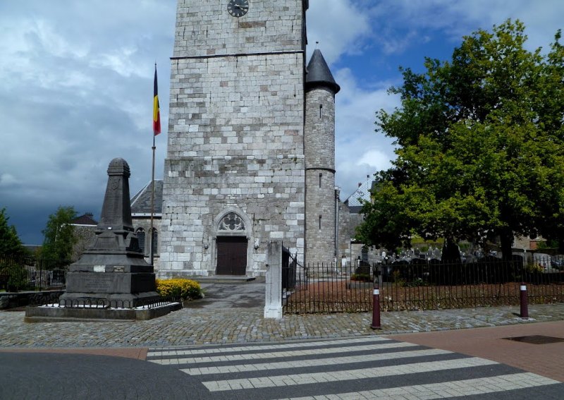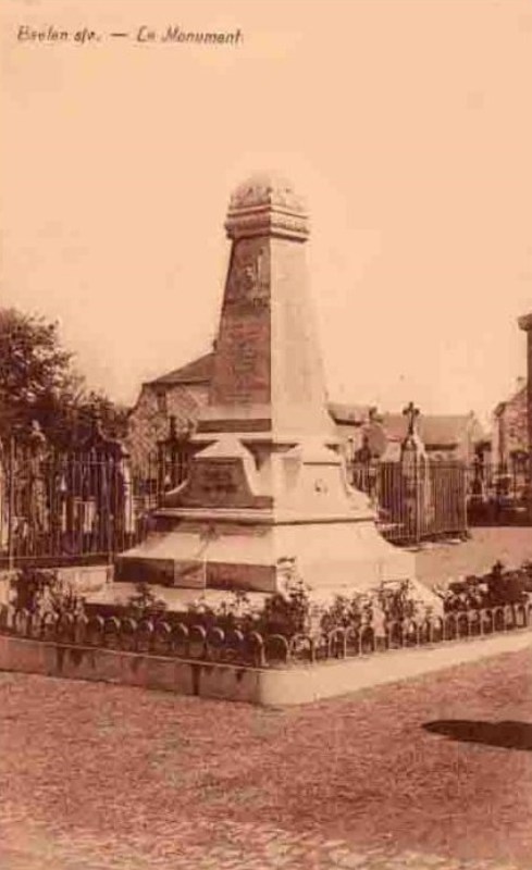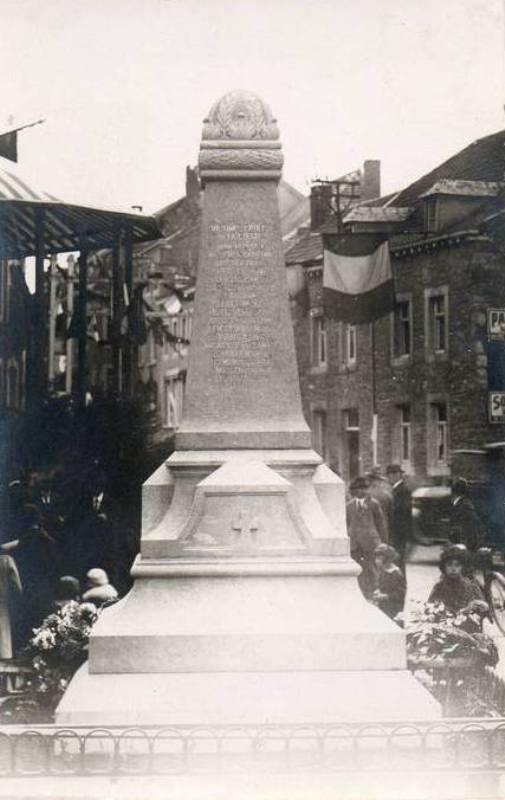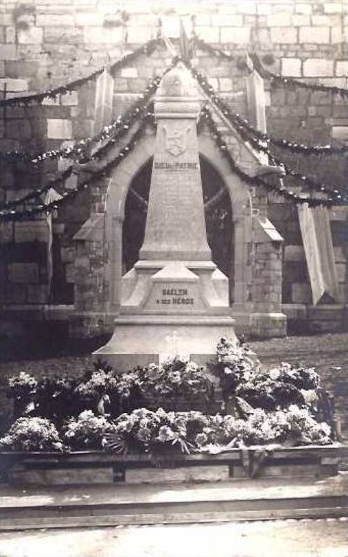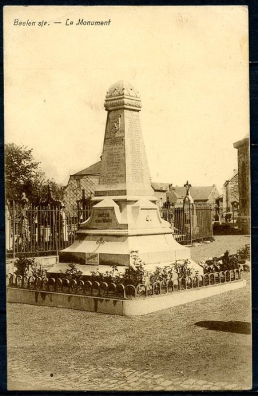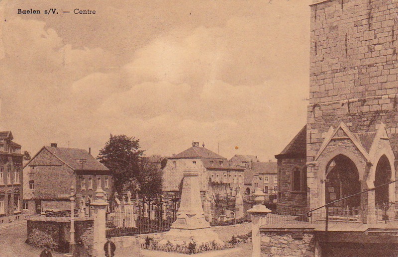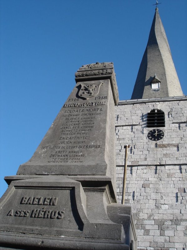 Localisation: Rue de l'Église, sur le parvis devant l'église Saint-Paul. Coordonnées GPS: +50°37'51.32", +5°58'14.19" Inscriptions Sur la face avant "1914 1918 DIEU ET PATRIE SOLDATS MORTS AU CHAMP D'HONNEUR [Six noms, classés par ordre alphabétique] EN CAPTIVITÉ [Un nom] DES SUITES DE LEURS BLESSURES [Quatre noms, classés par ordre alphabétique sauf un] BAELEN À SES HÉROS 1940 À NOS FRÈRES D'ARMES 1945 HOMMAGE DE LA POPULATION DE LA COMMUNE DE BAELEN S/VESDRE À SES GLORIEUX ENFANTS, MORTS POUR LA PATRIE TÉMOIGNAGE DE RECONNAISSANCE AUX COMBATTANTS, PRISONNIERS POLITIQUES, RÉFRACTAIRES, RÉSISTANTS. GLOIRE ET HONNEUR" Sur une plaque apposée sur la partie consacrée aux victimes 1940-1945 "HOMMAGE À NOS VOLONTAIRES DE GUERRE 1914-1918 1940-1945 COMMUNE DE BAELEN" Sur la grille en fer forgé au pied du monument "TU ES LIBRE SOUVIENS TOI" Sur la face gauche "COMBATTANTS SURVIVANTS [Vingt-huit noms, classés par ordre alphabétique] CEUX QUI PIEUSEMENT SONT MORTS POUR LA PATRIE ONT DROIT QU'À LEUR CERCUEIL LA FOULE VIENNE ET PRIE (V.HUGO)" Sur la face droite "COMBATTANTS SURVIVANTS [Vingt-huit noms, classés par ordre alphabétique] PASSANTS SOUVENEZ-VOUS." Sur la face arrière "RECONNAISSANCE À NOS PRISONNIERS POLITIQUES ET VICTIMES CIVILES DE LA GUERRE [Dix-huit noms, non classés par ordre alphabétique] BEATI, MORTUI QUI IN DOMINO MORIUNTUR OPERA ENIM ILLORUM SEQUUNTUR ILLOS (APOC. XIV 13)" Informations complémentaires Architecte: Ch; PHILIPPART de Herve Sculpteur: Fernand HEUZE de Verviers Matériau: petit granit Signatures sur le monument: "CH. PHILIPPART Architecte HERVE" et "FERN. HEUZE Sculpteur VERVIERS" Le monument, en forme d’obélisque, porte de nombreuses inscriptions. Sur la face avant, on peut y voir un écu au lion belge. À la base de l’obélisque, un relief de forme trapézoïdale de chaque côté, porte la mention "BAELEN À SES HÉROS" à l’avant et une croix chrétienne sur les autres faces. La face avant du socle porte la trace du remplacement de la dalle centrale, avec une inscription rendant hommage aux combattants, prisonniers politiques, réfractaires et résistants de la Seconde Guerre. Sur les autres côtés du socle, une citation de Victor Hugo et une citation de l’Apocalypse en latin (Heureux ceux qui sont morts en Dieu, car leurs actes les suivent. Apoc. 14,13) Le monument a été inauguré le 10 mai 1925 (Source [276]). Voir les noms mentionnés sur ce monument |