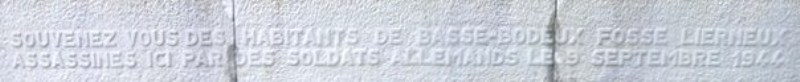 Localisation de ce monument: Au bout d'une voie sans issue, le long de la N651, entre Basse-Bodeux et Les Villettes. Coordonnées GPS du monument: (+ ou -) +50°20'27.50", +5°47'55.85". Inscription figurant sur le monument "SOUVENEZ-VOUS DES HABITANTS DE BASSE-BODEUX FOSSE LIERNEUX ASSASSINÉS ICI PAR DES SOLDATS ALLEMANDS LE 9 SEPTEMBRE 1944 [Sept noms, sur sept croix en pierre, classés par ordre alphabétique] B G L M N S T" Information complémentaire: Les 7 lettres à l'avant du monument sont les initiales des noms des 7 habitants assassinés. Voir les noms mentionnés sur ce monument |