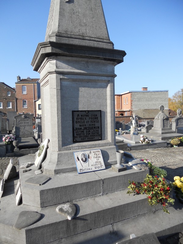 Localisation de ce monument: Dans le cimetière communal, Rue du Cimetière. Coordonnées GPS: +50°37'27.30", +5°39'04.14". Inscription figurant sur le monument "RECONNAISSANCE DE LA COMMUNE DE BEYNE-HEUSAY À SES ENFANTS MORTS POUR LA LIBERTÉ ET L'INDÉPENDANCE DE LA BELGIQUE" Architecte: DUPONT de Bois-de-Breux Il n'y a pas de nom gravé sur le monument mais plusieurs plaques (l'une d'entre elles concerne un combattant de 1940-1945) sont disposées tout autour de celui-ci dont une avec dix-neuf photos dont certaines sont malheureusement presqu'effacées. Plus d'informations concernant ces personnes |