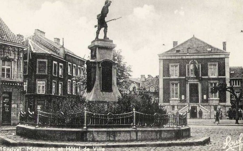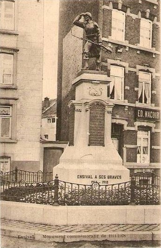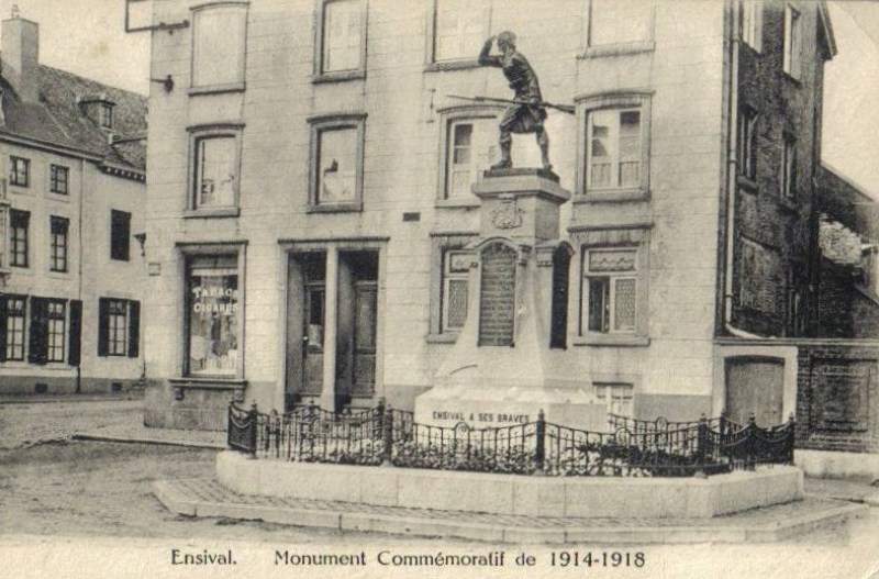 Localisation de ce monument: À l'angle de la Rue Jean-Martin Maréchal et En Mi-Ville, à proximité de la Grand-Place. Coordonnées GPS: +50°34'52.50", +5°50'21.98". Inscriptions figurant sur le monument Face avant "L'UNION FAIT LA FORCE SOLDATS MORTS POUR LA PATRIE [Douze noms, classés par ordre alphabétique] ENSIVAL À SES BRAVES 1914 - 1918" Face latérale gauche "SOLDATS MORTS POUR LA PATRIE [Douze noms, classés par ordre alphabétique sauf un]" Face arrière "SOLDATS MORTS POUR LA PATRIE [Douze noms, classés par ordre alphabétique]" Face latérale droite "SOLDATS MORTS POUR LA PATRIE [Trois noms, classés par ordre alphabétique] MORTS EN DÉPORTATION [Deux noms, classés par ordre alphabétique] MORTS DES SUITES DE LEUR DÉPORTATION [Trois noms, classés par ordre alphabétique sauf le dernier]" Réalisation de la statue: J. BLOOM Réalisation des plaques: DEHIN Frères - Liège Bronzes d'Art Voir les noms mentionnés sur ce monument |