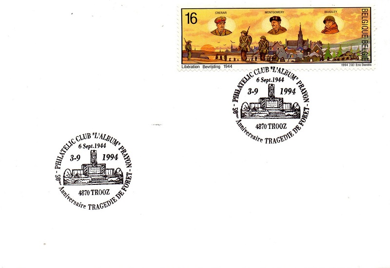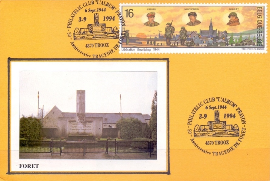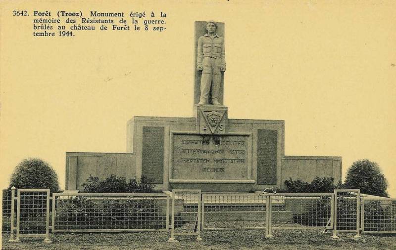 Localisation: Place François Piscart, le long de la Rue Forêt-Village. Coordonnées GPS: +50°35'01.10", +5°41'53.82" Inscriptions À l'avant du monument Partie centrale "AS MORIENTES CRUDELITER MILITES UMBRAE DIXISTIS LIBERTATEM IMMORTALEM VOLUMUS Ce qui signifie: EN MOURANT D'UNE MANIÈRE CRUELLE SOLDATS DE L'OMBRE, VOUS AVEZ DIT: NOUS VOULONS UNE LIBERTÉ IMMORTELLE" Plaque à gauche "[Trente-cinq noms, classés par ordre alphabétique]" Plaque à droite "[Vingt-deux noms, classés par ordre alphabétique] DISPARUS [Onze noms, classés par ordre alphabétique]" Petite plaque en marbre posée devant le monument "UNE PENSÉE CHAQUE JOUR À NOS COMPAGNONS ET AMIS DE COMBAT JEAN STINE MARIE COURTOIS" À l'arrière du monument Plaque de gauche "[Vingt-huit noms, classés par ordre alphabétique sauf un]" Plaque dans la crypte "ICI REPOSENT ONZE MAQUISARDS A.S. NON IDENTIFIÉS MORTS POUR LA PATRIE ET LA LIBERTÉ" Plaque de droite "[Vingt-sept noms, classés par ordre alphabétique sauf un]" Informations complémentaires En septembre 1944, alors que la Belgique est en train d'être libérée par les forces alliées, les nazis se livrent à de dernières atrocités. Une politique de terre brûlée dont les civils seront les principales victimes. Le village de Forêt, en province de Liège, aux abords du plateau de Herve, va être le lieu de l'un de ces actes terroristes. Un groupe de résistants de l'Armée Secrète, dont le quartier général se trouve dans les murs du château de Forêt, va faire l'objet de terribles représailles au mépris de toutes les règles de la guerre. Le monument rappelle les événements des 5 et 6 septembre 1944 et fut bâti en mai 1949 par l'architecte Joseph GODRON, l'entrepreneur L. GODRON, le tailleur de pierre J. LEDUC et Robert MASSART, un artiste de chez nous. Le monument-crypte fut conçu pour recevoir les corps des 11 résistants qui n'ont pu être identifiés et est un hommage aux combattants du C.T. Il a été inauguré le 4 septembre 1949. L'imposante statue qui domine le monument représente un maquisard debout et vêtu de l’uniforme salopette de l’A.S. Classement : 4 mai 1983 (Source [364]) Pour en savoir plus sur les événements tragiques de septembre 44 à Forêt La vérité sur la tragédie de Forêt et Travail de fin d'études primaires de Jérôme HALBOISTER Par ailleurs, on trouve, dans le cimetière communal à côté de l'église Sainte-Catherine, la sépulture d'un soldat de 1914-1918. Son nom a été ajouté dans la base de données Voir les noms mentionnés sur ce monument et sur la tombe individuelle |