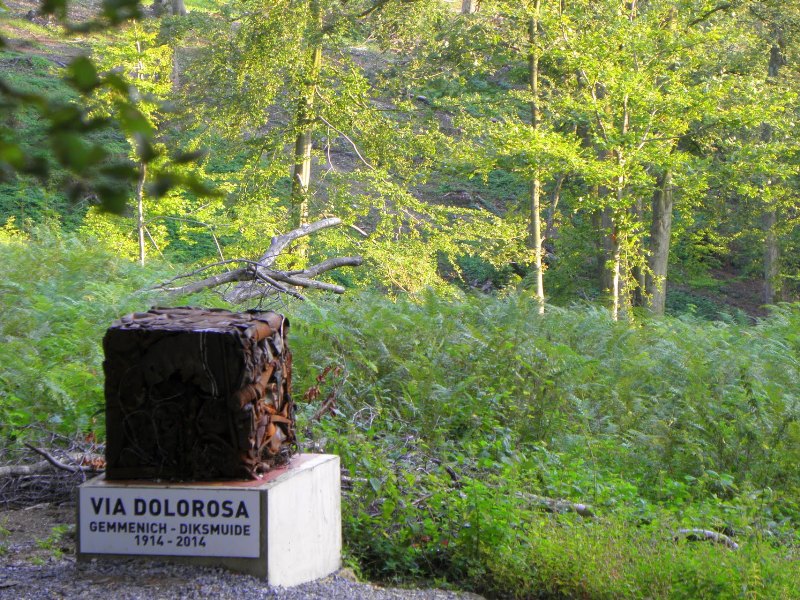 Localisation de ce monument: Route des Trois Bornes, à proximité du parking et du belvédère des Trois frontières. Coordonnées GPS: +50°45'12.54", +6°01'14.69" Inscriptions figurant sur le monument "VIA DOLOROSA GEMMENICH - DIKSMUIDE 1914 - 2014" Informations complémentaires: Ce petit monument est composé de douilles d’obus de 1914 cerclées de fils barbelés. Après Visé, Gemmenich est la seconde étape d’une « Via Dolorosa » longue de 250 km qui, jusqu’à Ypres, relie des lieux qui ont beaucoup souffert durant la Grande Guerre (voir: Via Dolorosa 1914) Ce monument ne comporte pas de noms |