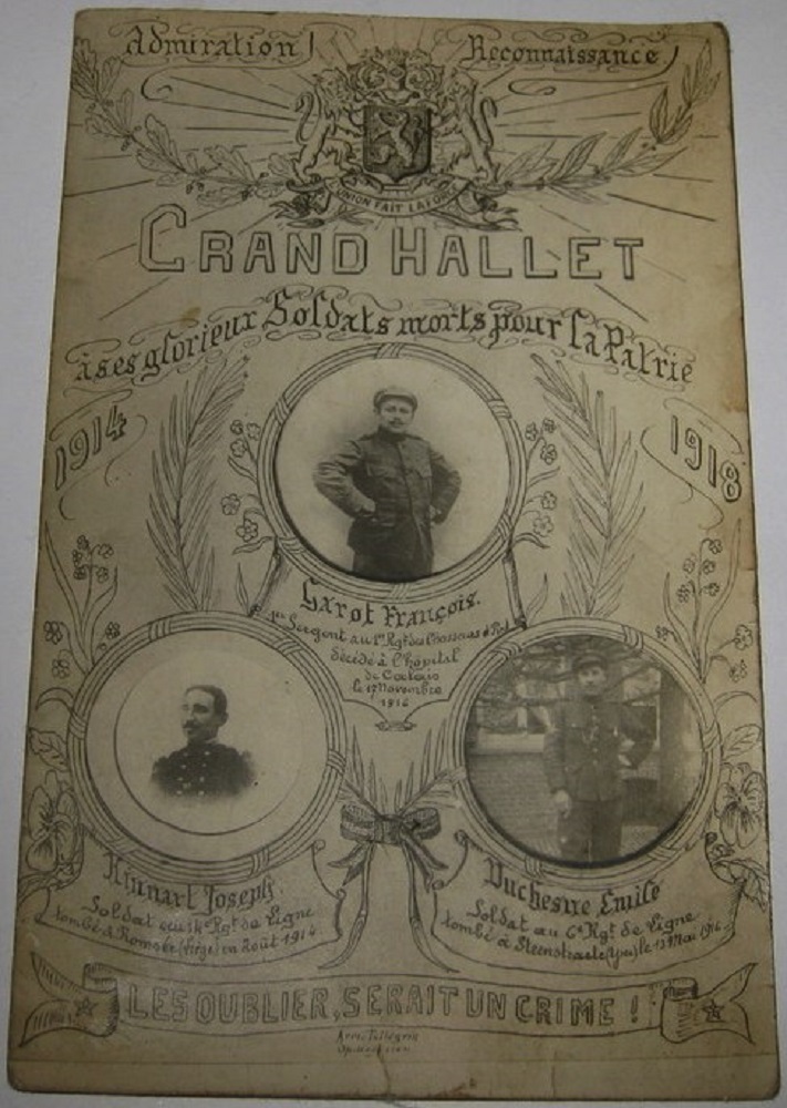 Localisation: Collection privée. Inscriptions figurant sur le document "ADMIRATION ET RECONNAISSANCE [Blason de la Belgique] GRAND HALLET À SES GLORIEUX SOLDATS MORTS POUR LA PATRIE 1914 - 1918 [Trois noms, avec photos, classés d'abord par grade et ensuite par date de décès, avec mention des grade, régiment, lieu et date de décès] LES OUBLIER SERAIT UN CRIME !" Voir les noms mentionnés sur le document |
