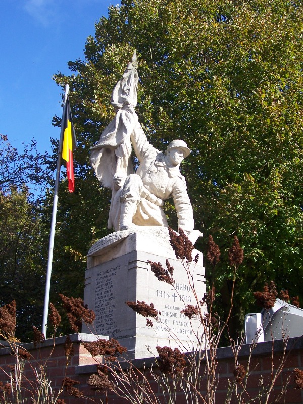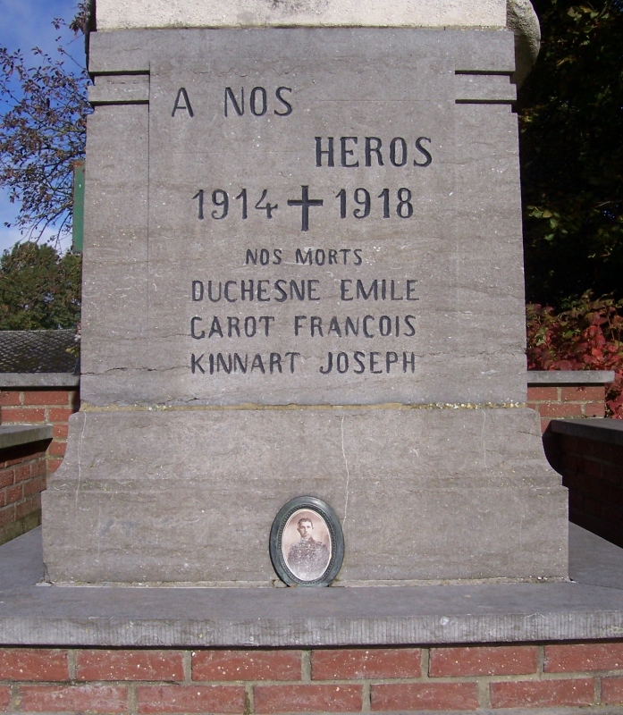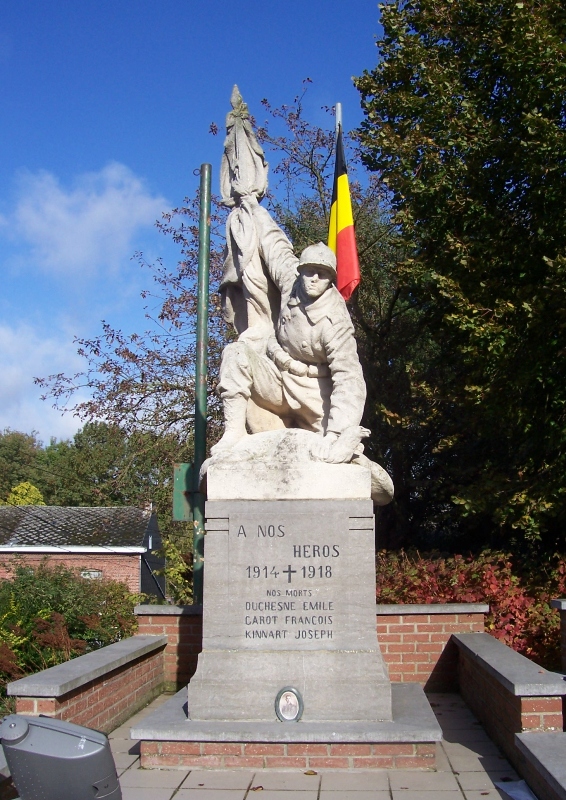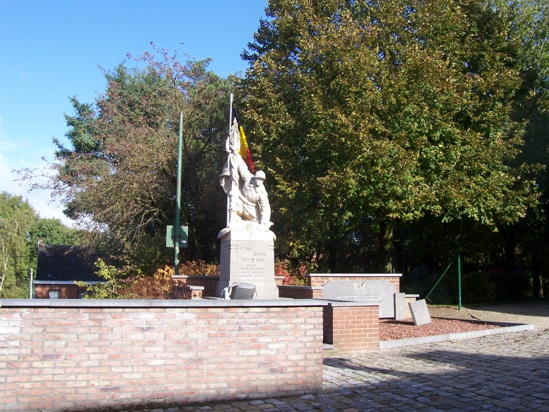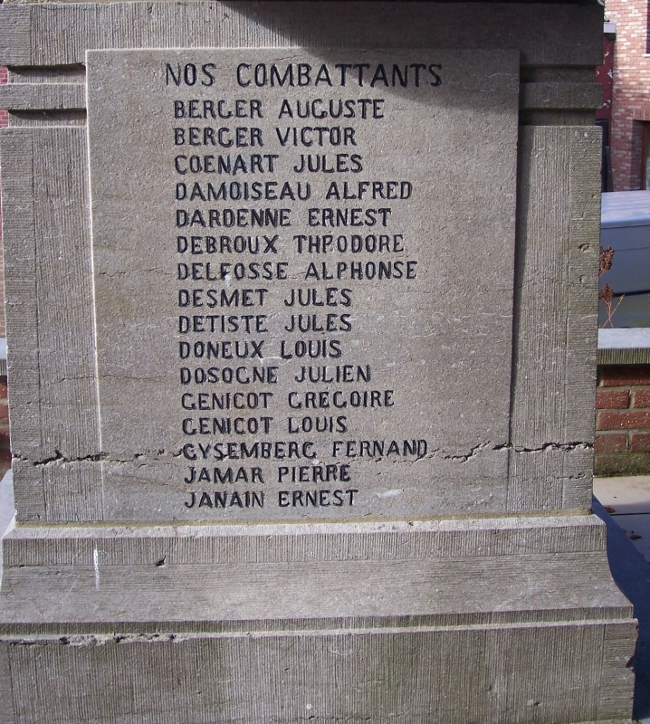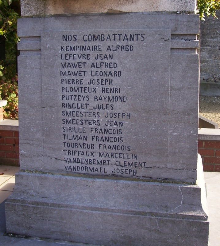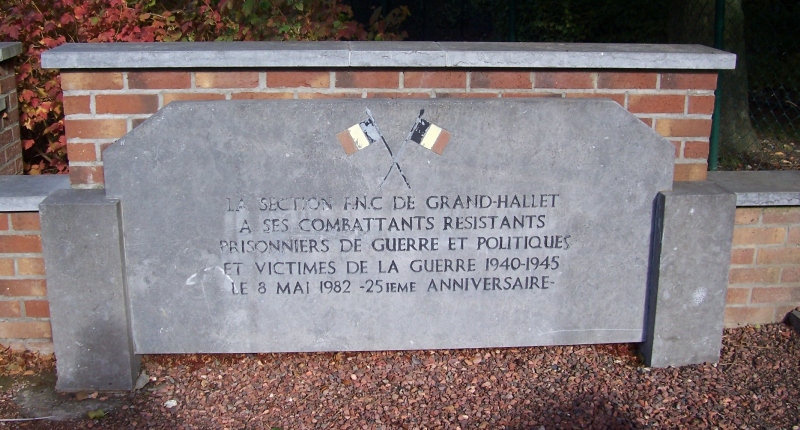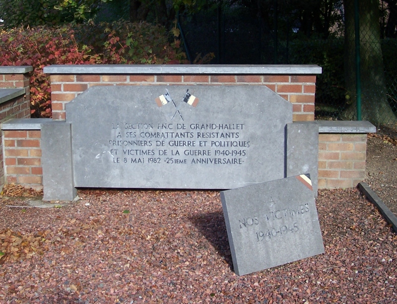 Localisation de ce monument: Rue Sainte-Blaise, à côté de l'église Sainte-Blaise. Coordonnées GPS: +50°41'39.07", +5°02'03.13" Inscriptions figurant sur le monument Sur le monument 1914 - 1918 Face avant "À NOS HÉROS 1914 + 1918 NOS MORTS [Trois noms, classés par ordre alphabétique]" Face droite "NOS COMBATTANTS [Seize noms, classés par ordre alphabétique]" Face gauche "NOS COMBATTANTS [Seize noms, classés par ordre alphabétique sauf un]" Sur le monument 1940-1945 "LA SECTION F.N.C. DE GRAND-HALLET À SES COMBATTANTS RÉSISTANTS PRISONNIERS DE GUERRE ET POLITIQUES ET VICTIMES DE LA GUERRE 1940-1945 LE 8 MAI 1982 - 25IEME ANNIVERSAIRE" Sur la plaque devant le monument 1940-1945 "À NOS VICTIMES 1940 - 1945" Voir les noms mentionnés sur ce monument |