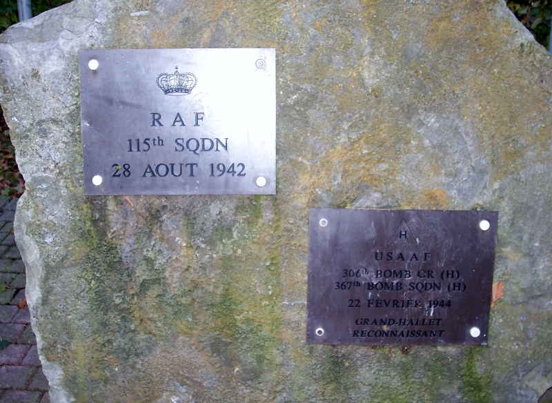 Localisation de ce monument: Rue Sainte-Blaise, à côté de l'église Saint-Blaise. Coordonnées GPS: +50°41'39.07", +5°02'03.13" Inscriptions figurant sur le monument Sur la plaque de gauche "RAF 115TH SQDN 28 AOÛT 1942" Sur la plaque de droite "H USAAF 306TH BOMB GR (H) 367TH BOMB SQDN (H) 22 FÉVRIER 1944 GRAND-HALLET RECONNAISSANT" Ce monument ne comporte pas de noms |