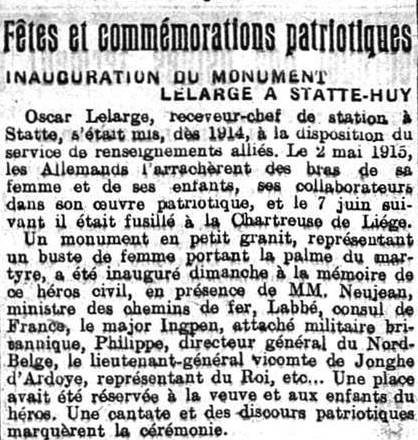 Localisation: Rue René DUBOIS (N 643a). Coordonnées GPS: +50°31'44.90", +5°13'17.66" Inscriptions Sur la face avant "À OSCAR LELARGE MORT POUR LA PATRIE" Sur la face droite "ATTACHÉ AU SERVICE D'OBSERVATION DES ARMÉES ALLIÉES FUSILLÉ À LIÈGE PAR LES ALLEMANDS LE 7 JUIN 1915 À 47 ANS" Inauguration : 21 juillet 1921. Informations complémentaires: À l'origine, le monument se trouvait à côté de la gare de Statte. Plus d'informations concernant cette personne |