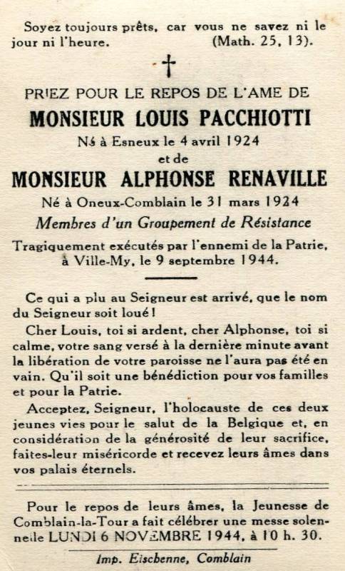 Localisation de ce monument: Route des Ardennes, à côté de l'entrée du Château de Ville, aujourd'hui internat autonome de la Communauté Française. Coordonnées GPS: +50°24'49.18", +5°35'14.01". Inscription figurant sur le monument "IN MEMORIAM [Deux noms avec lieu et date de naissance] MEMBRES DE LA RÉSISTANCE LÂCHEMENT ASSASSINÉS DANS CE PARC PAR LES NAZIS LE 9 SEPTEMBRE 1944 SOUVENONS-NOUS DE NOS MARTYRS" Inscriptions figurant sur le souvenir Voir ci-dessous Plus d'informations concernant ces personnes |