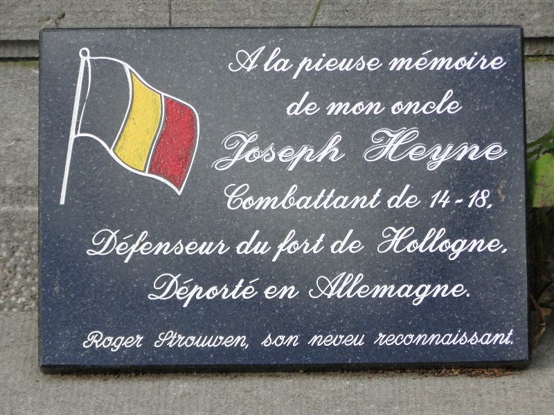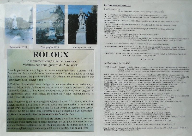 Localisation: Rue du Monument. Coordonnées GPS: +50°39'03.28", +5°23'54.05" Inscriptions Sur la face avant "1914 - 1918 1940 - 1945 AUX HÉROS DE LA COMMUNE DE ROLOUX DÉFENSEURS DE LA PATRIE [Un nom avec lieu et date de décès]" Sur la face droite "[Sept noms, classés par ordre alphabétique]" Sur la face gauche "[Sept noms, classés par ordre alphabétique sauf le dernier]" Sur la tombale à l'avant du monument "[Vingt-sept noms, classés par ordre alphabétique]" Sur une plaque en marbre noir posée devant le monument "À LA PIEUSE MÉMOIRE DE MON ONCLE JOSEPH HEYNE COMBATTANT DE 14-18, DÉFENSEUR DU FORT DE HOLLOGNE, DÉPORTÉ EN ALLEMAGNE. ROGER STROUWEN, SON NEVEU RECONNAISSANT" Informations complémentaires On trouve également un panneau explicatif reprenant notamment tous les noms qui sont gravés sur le monument. Ce panneau est fixé sur la rambarde devant le monument, entre les deux escaliers (voir dernière photo ci-dessous). Matériau: petit granit Hauteur : 4,20 m Architecte: P. JACQUES Réalisation du monument: F. CLOSE Monument inauguré en juillet ou août 1924. Le socle porte une plaque sur la face avant, qui aurait été placée après la Seconde Guerre, et sur les côtés sont gravés les noms des anciens combattants de 14-18. Une tombale placée devant le monument cite les noms de la Seconde Guerre (Source [276]) Voir les noms mentionnés sur ce monument |