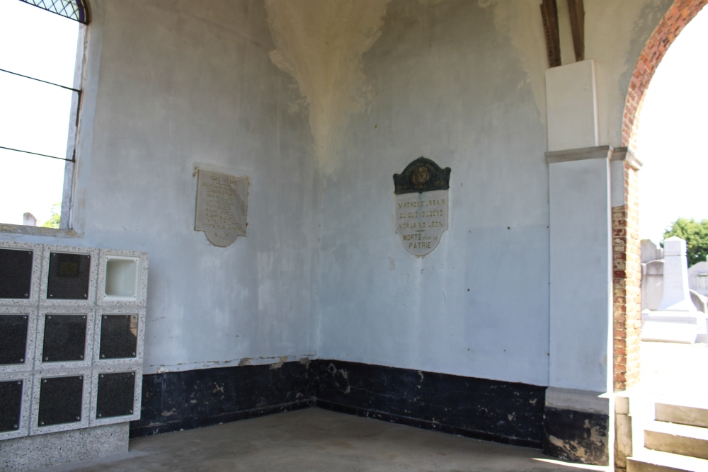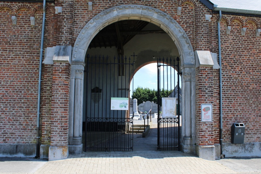 Localisation: Rue Eugène Quique, dans le porche d'entrée du cimetière communal. Coordonnées GPS: +50°33'57.04", +5°13'47.13" Inscriptions Sur la plaque Berchmans "N'OUBLIONS JAMAIS 1914 1918 [Trois noms, classés par ordre alphabétique] MORTS POUR LA PATRIE" Sur la plaque à gauche "1940 - 1945 [Sept noms, classés par ordre alphabétique] MORTS POUR LA PATRIE R.I.P." Informations complémentaires La plaque munie du fronton Berchmans et placée dans le porche du cimetière diffère des plaques des autres communes par la qualité de la pierre et le texte plus laconique. Sans doute le plaque originelle était-elle placée au mur de l’ancienne maison communale (Source [276)] De plus, on trouve, dans ce cimetière, la tombe d'une victime de la guerre 1940-1945. Son nom a été ajouté dans la base de données. Voir les noms mentionnés sur ces plaques et sur cette tombe |