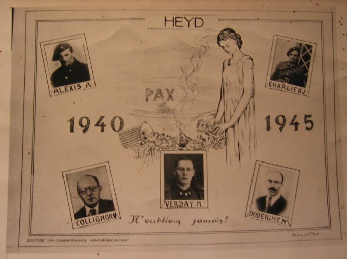Localisation de ce document: Collection privée Inscription figurant sur le document "HEYD PAX 1940 1945 [Cinq photos, non classées par ordre alphabétique] N'OUBLIONS JAMAIS !" Voir les noms mentionnés sur ce document |