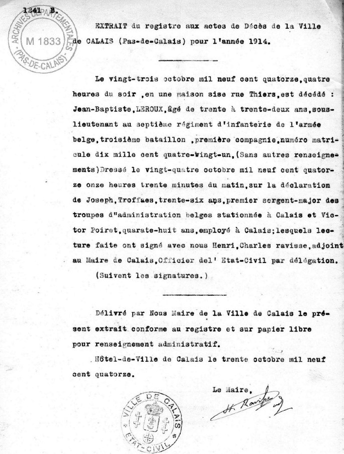 Acte de décès à Calais, Pas-de-Calais, FR (Source [167])