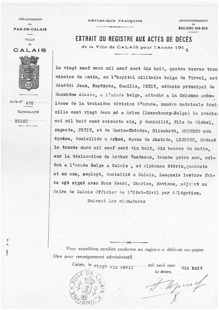 Acte de décès à Calais, Pas-de-Calais, FR (Source [167])