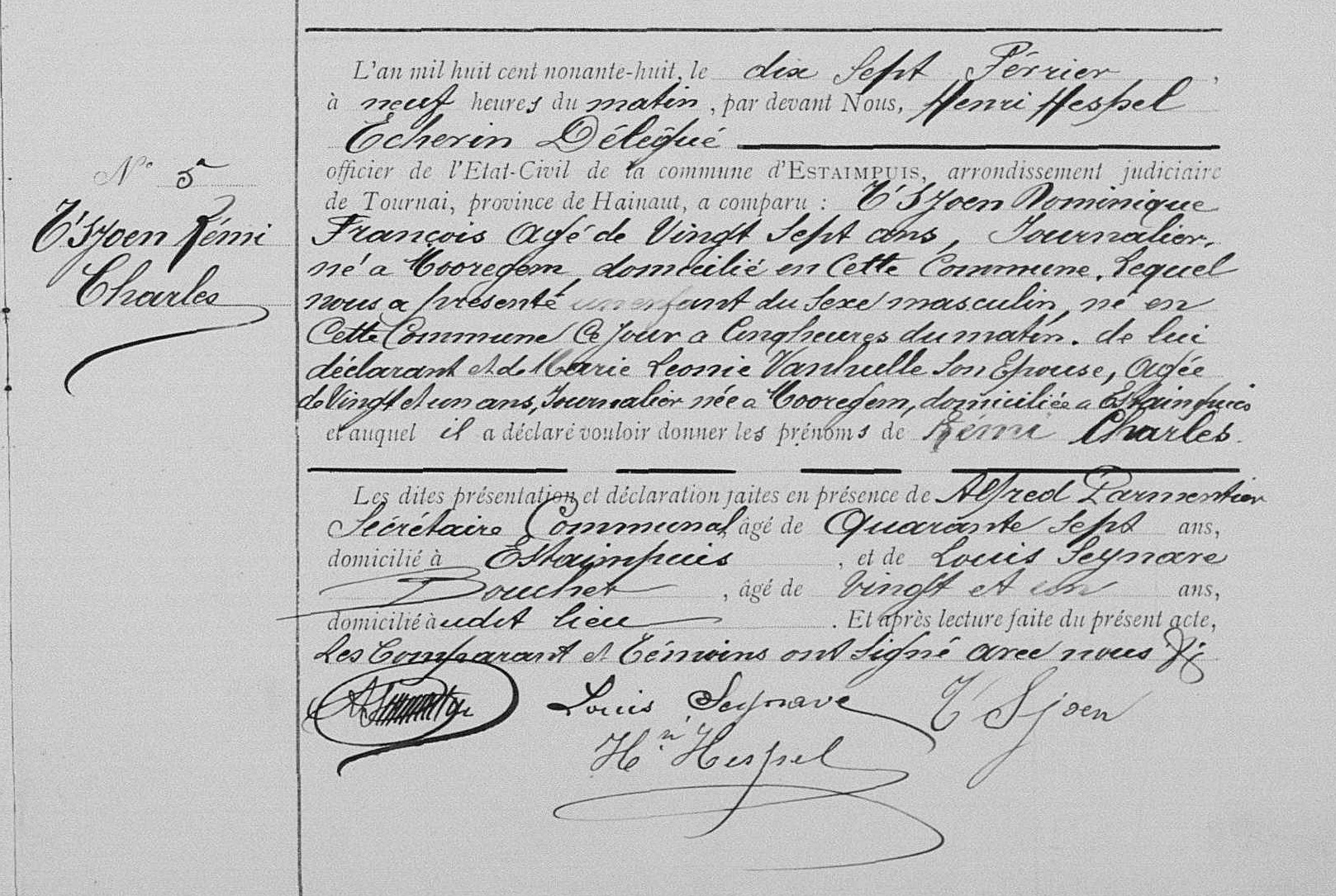 Acte de naissance à Estaimpuis, HT, BE (Source [358])