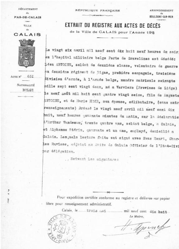 Overlijdensakte te Calais, Pas-de-Calais, FR -