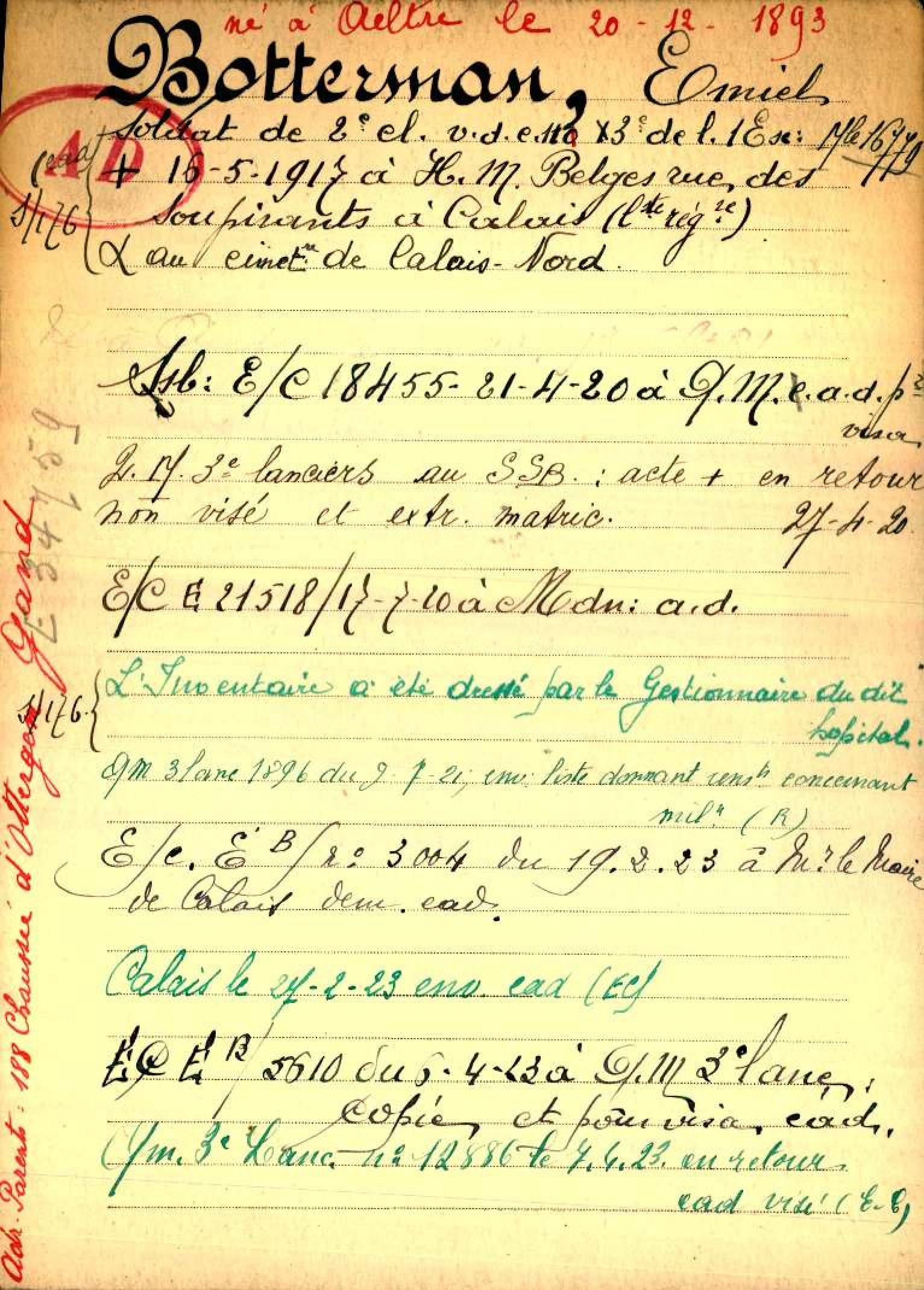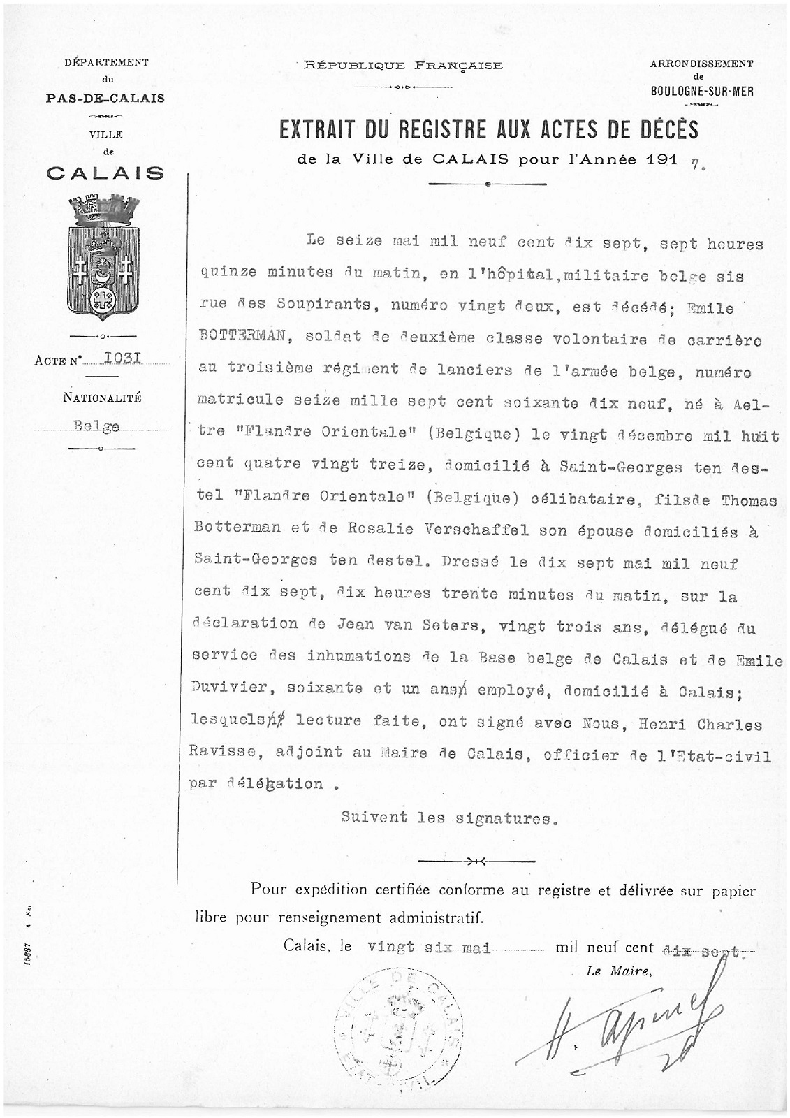 Overlijdensakte te Calais, Pas-de-Calais, FR -