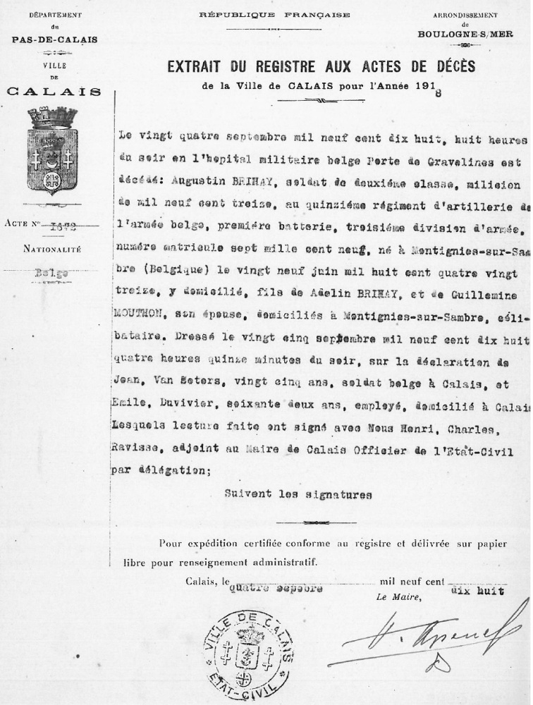 Overlijdensakte te Calais, Pas-de-Calais, FR