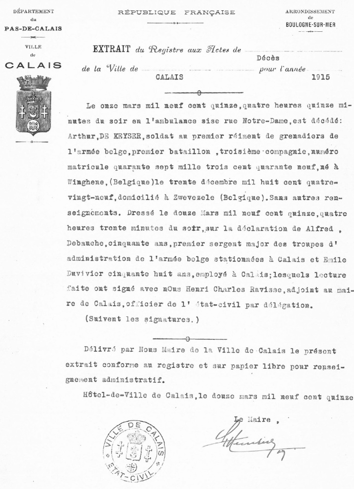 Overlijdensakte te Calais, Pas-de-Calais, FR (Bron [167]
