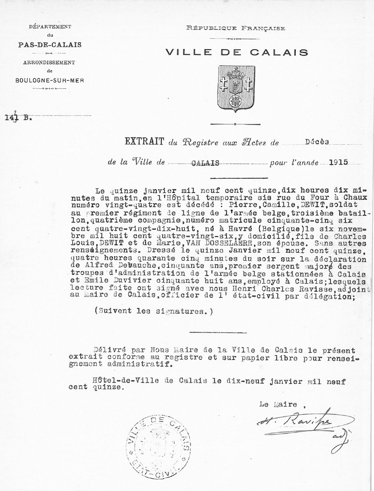 Overlijdensakte te Calais, Pas-de-Calais, FR -