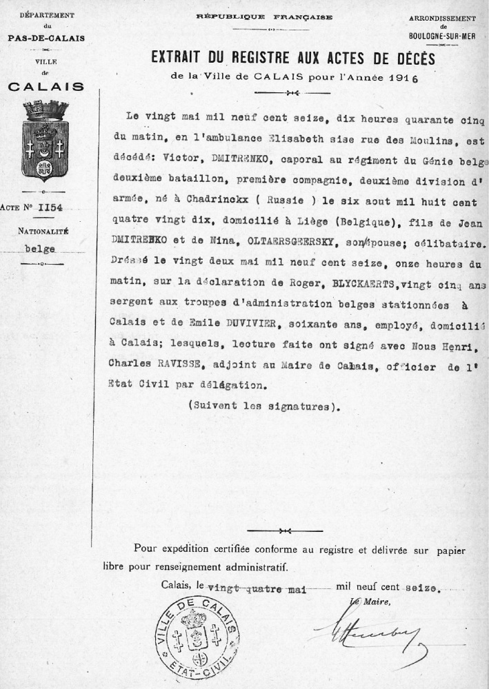 Overlijdensakte te Calais, Pas-de-Calais, FR -