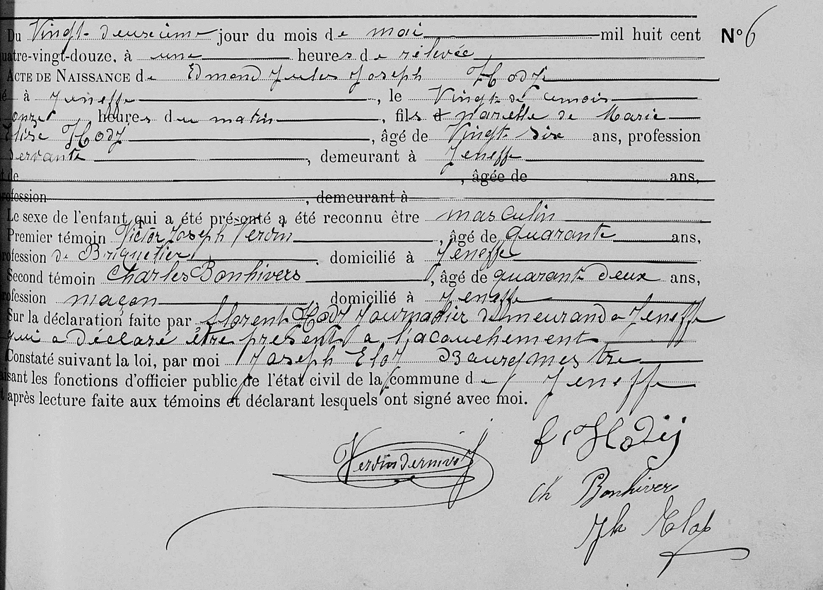 Acte de naissance à Jeneffe, NA, BE sous le nom de HODY (Source