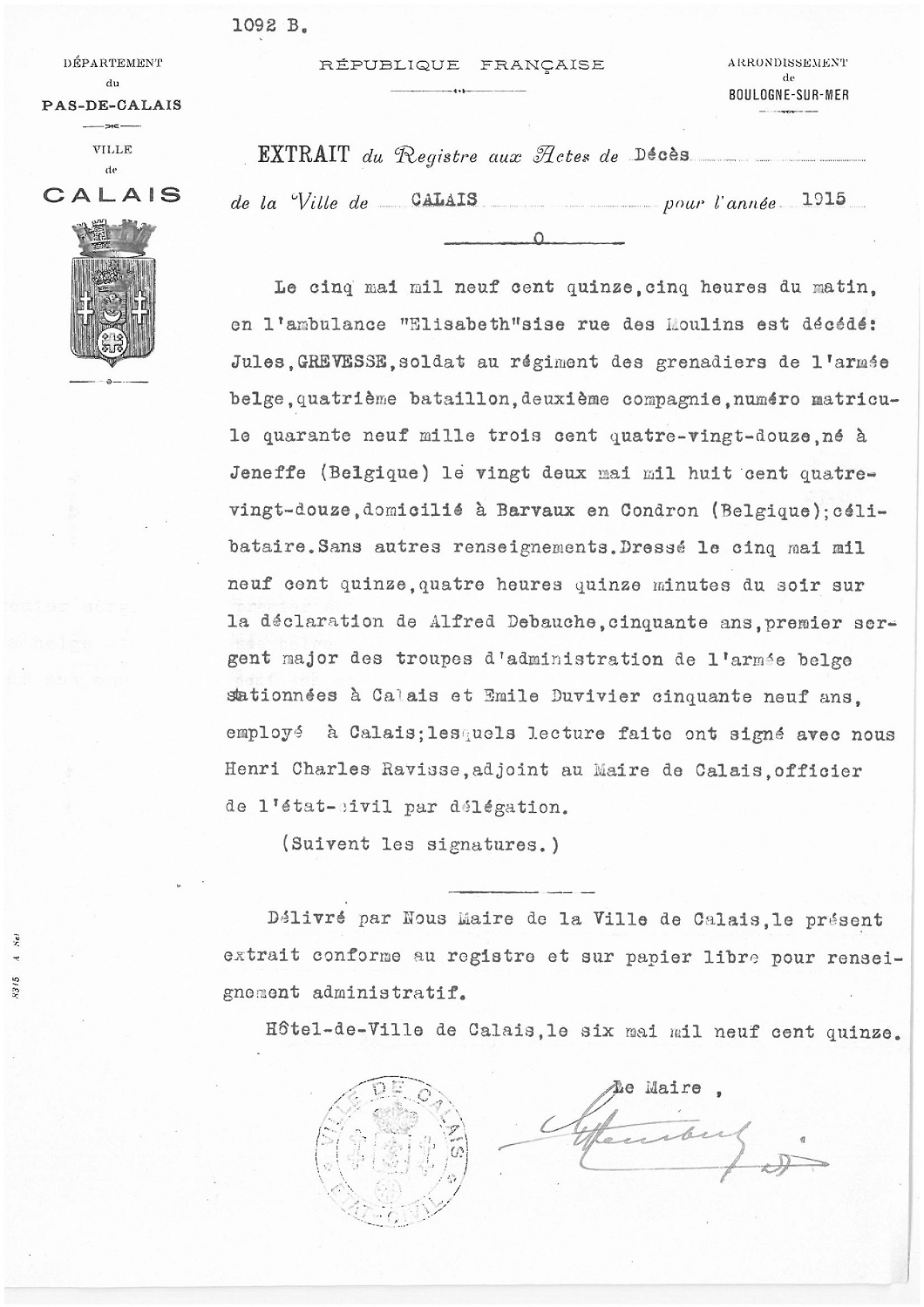 Acte de décès à Calais, Pas-de-Calais, FR (Source [167])
