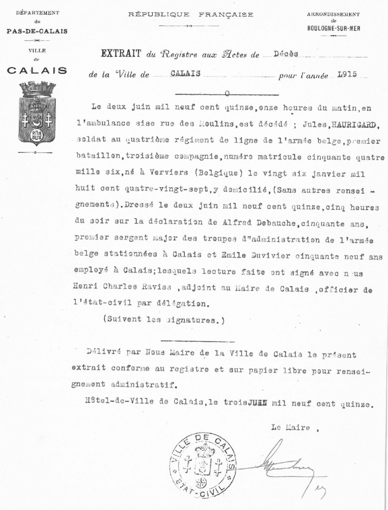 Acte de décès à Calais, Pas-de-Calais, FR (Source [167])