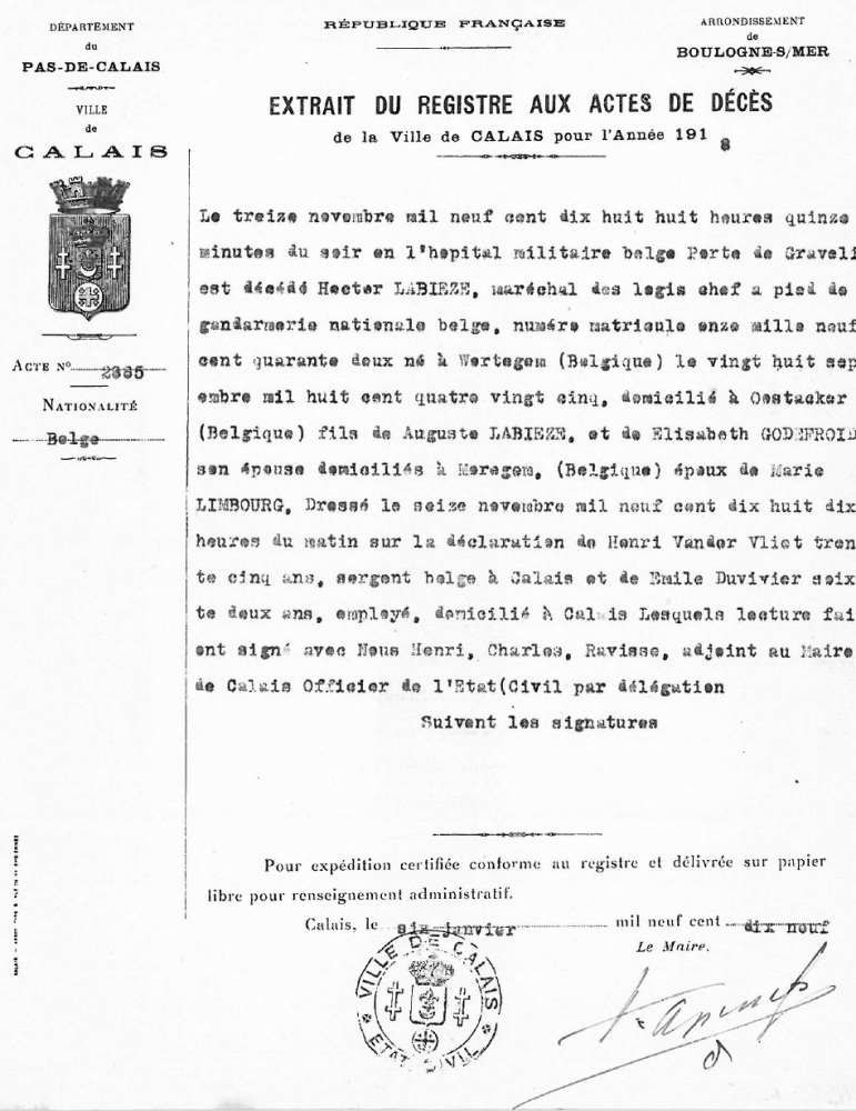 Overlijdensakte te Calais, Pas-de-Calais, FR