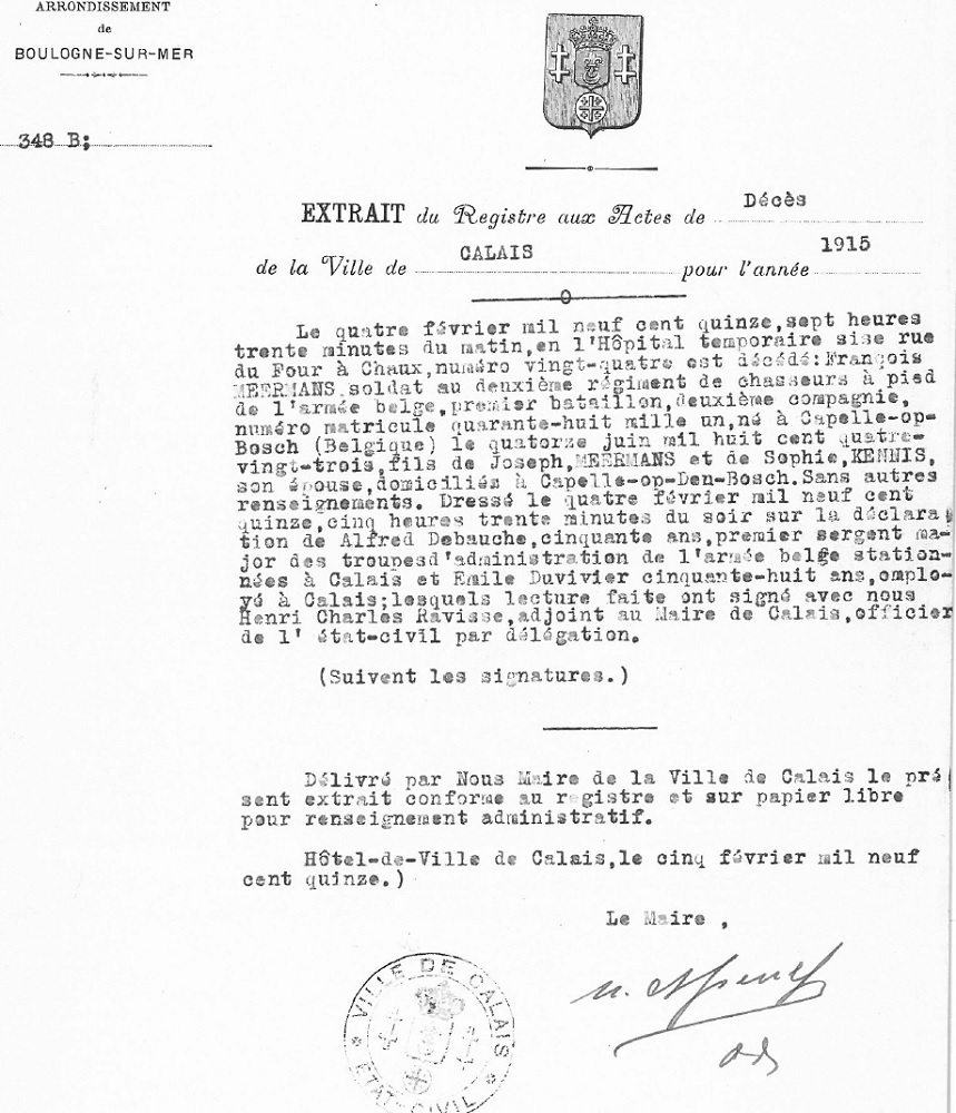Overlijdensacte te Calais, Pas-de-Calais, FR