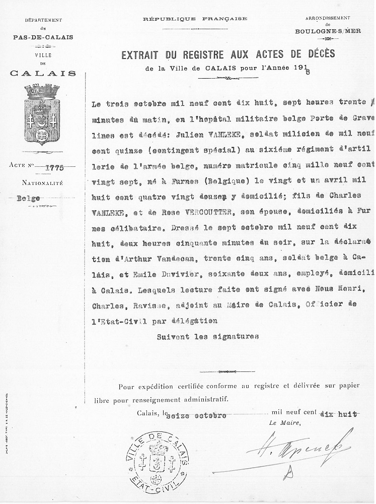 Overlijdensakte te Calais, Pas-de-Calais, FR -