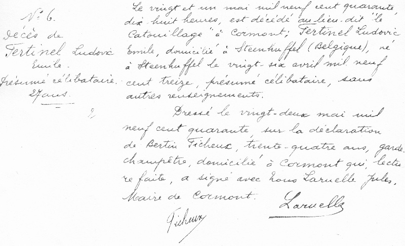 Overlijdensakte nr 6 1940 te Cormont, Pas-de-Calais, FR