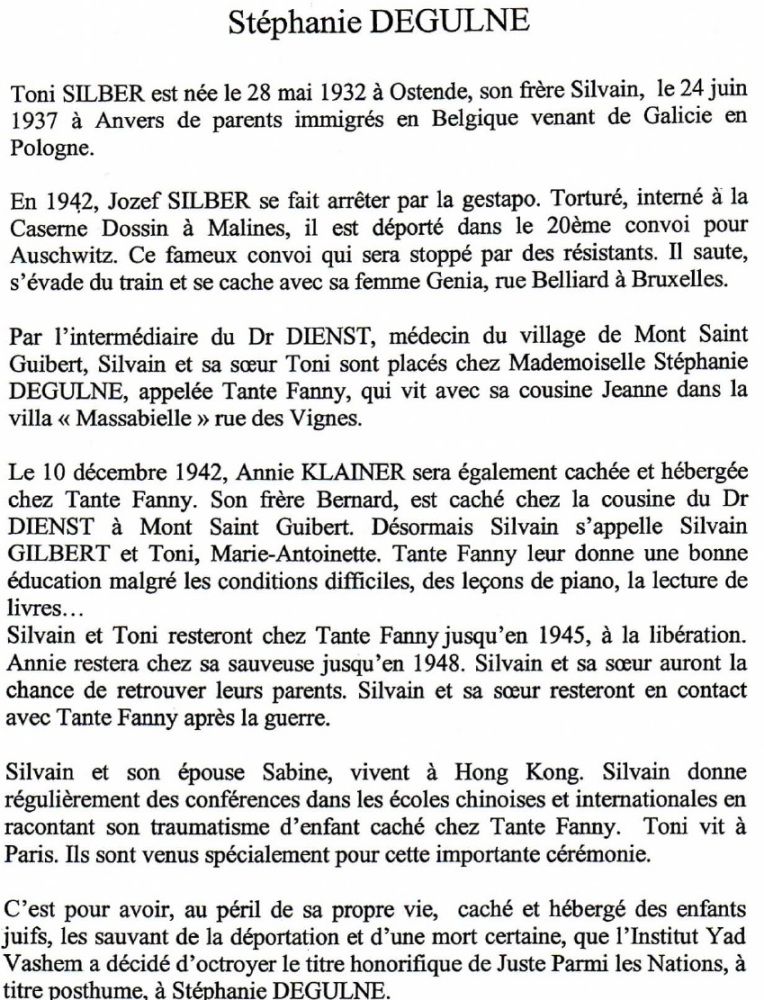 Stéphanie DEGULNE fut honorée (à titre posthume) du titre de « Juste