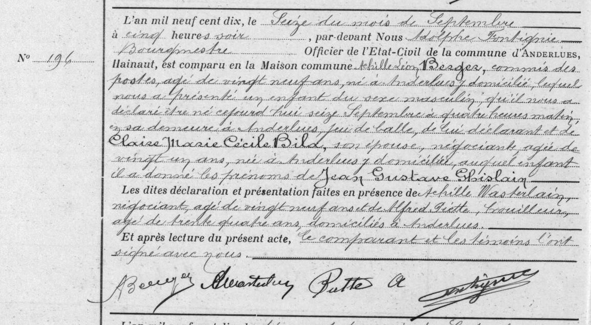 Anderlues, HT, BE: Acte de naissance n° 196 (1910) (Source [229])