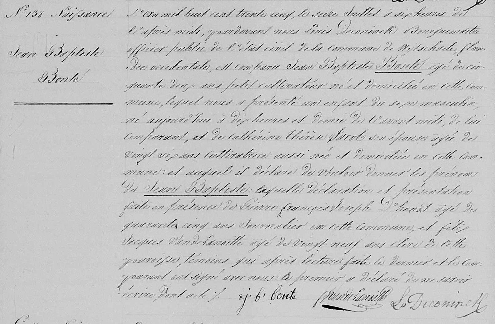 Wijtschate, WV, BE: Geboorteakte nr 138 (1835) (Bron [358])