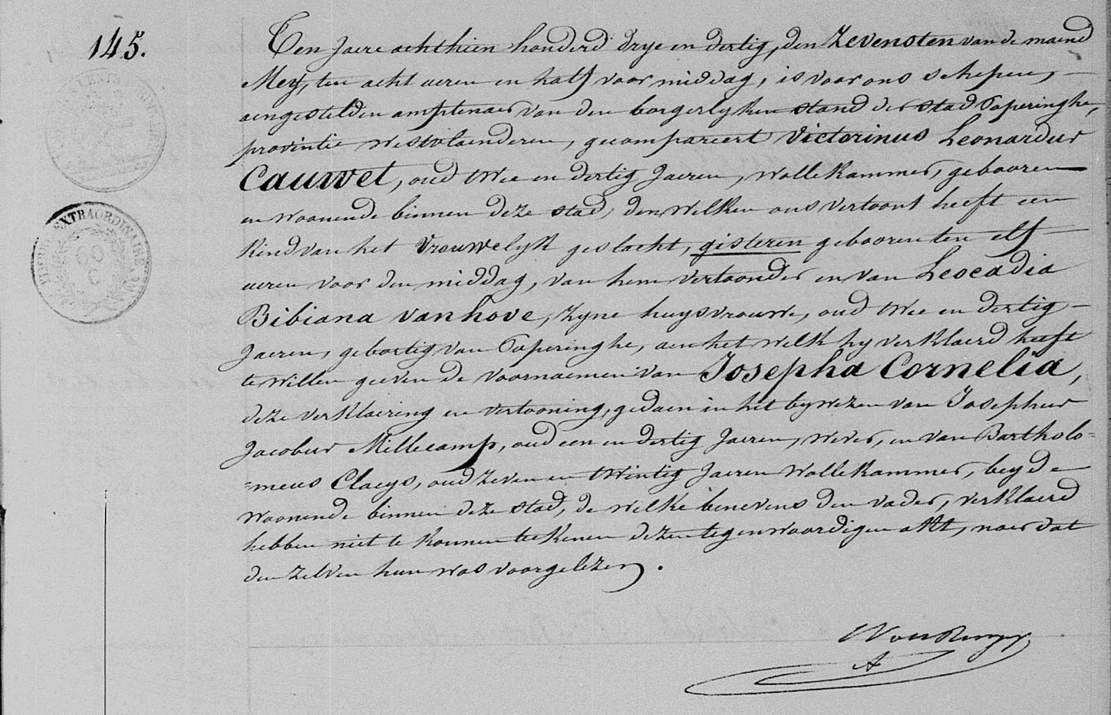 Poperinge, WV, BE: Geboorteakte nr 145 (1833) (Bron [358])