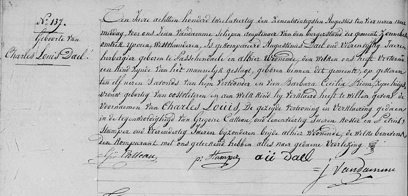 Zonnebeke, WV, BE: Geboorteakte nr 137 (1842) (Bron [358])