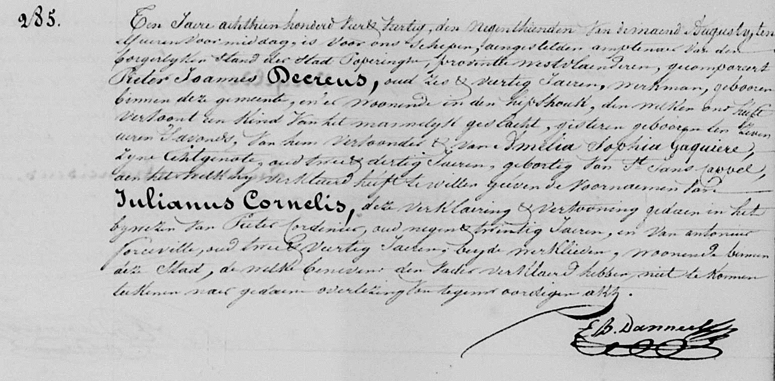 Poperinge, WV, BE: Geboorteakte nr 285 (1844) (Bron [358])
