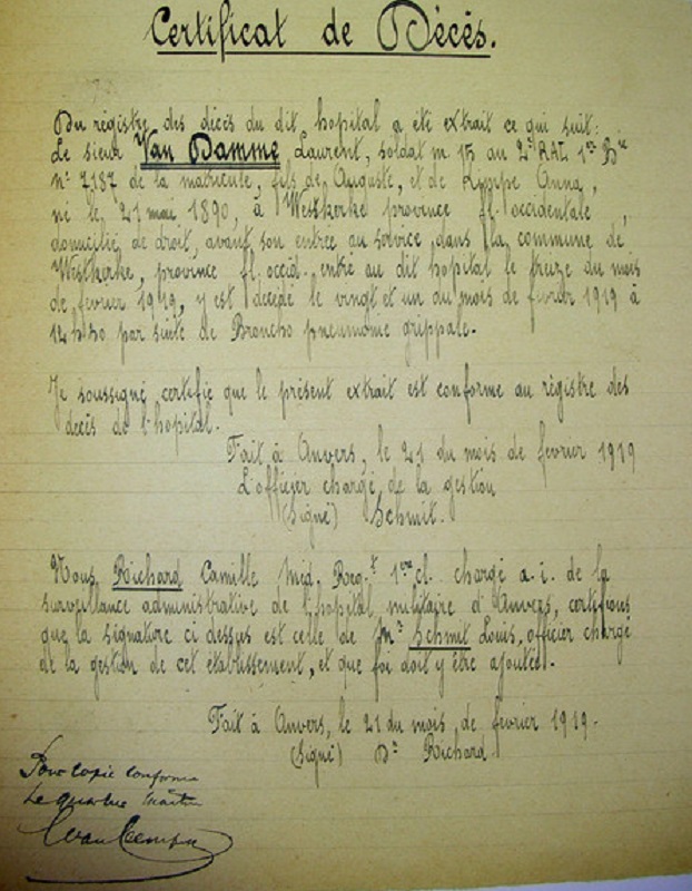 Overlijdensakte, Belgisch militair hospital, Antwerpren (Anvers),