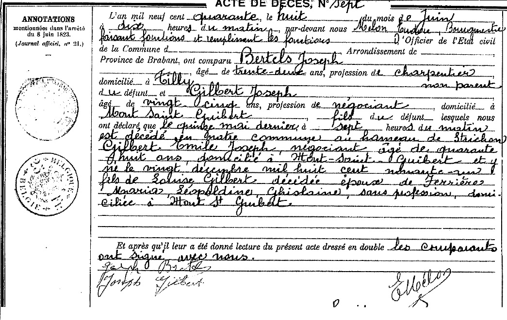 Tilly, BW, BE: Acte de décès n° 7 (1940) (Source: Commune de