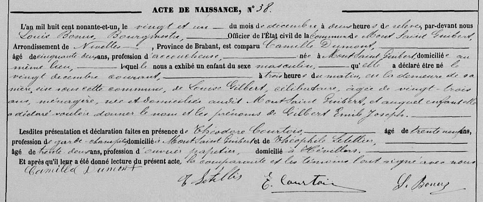 Mont-Saint-Guibert, BW, BE: Acte de naissance n° 38 (1891) (Source
