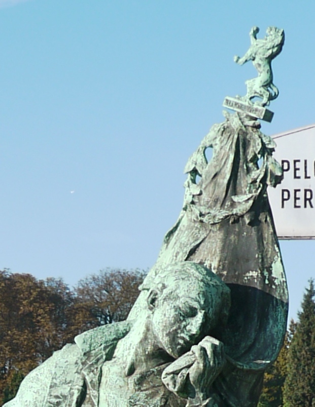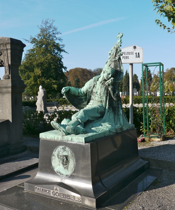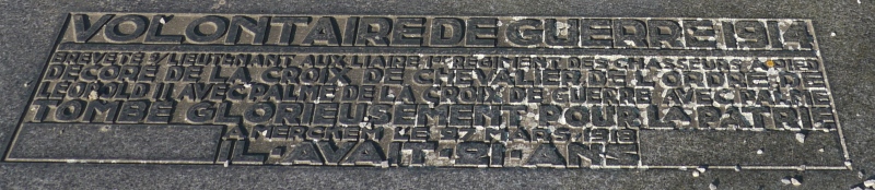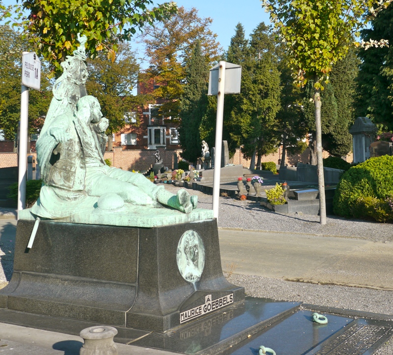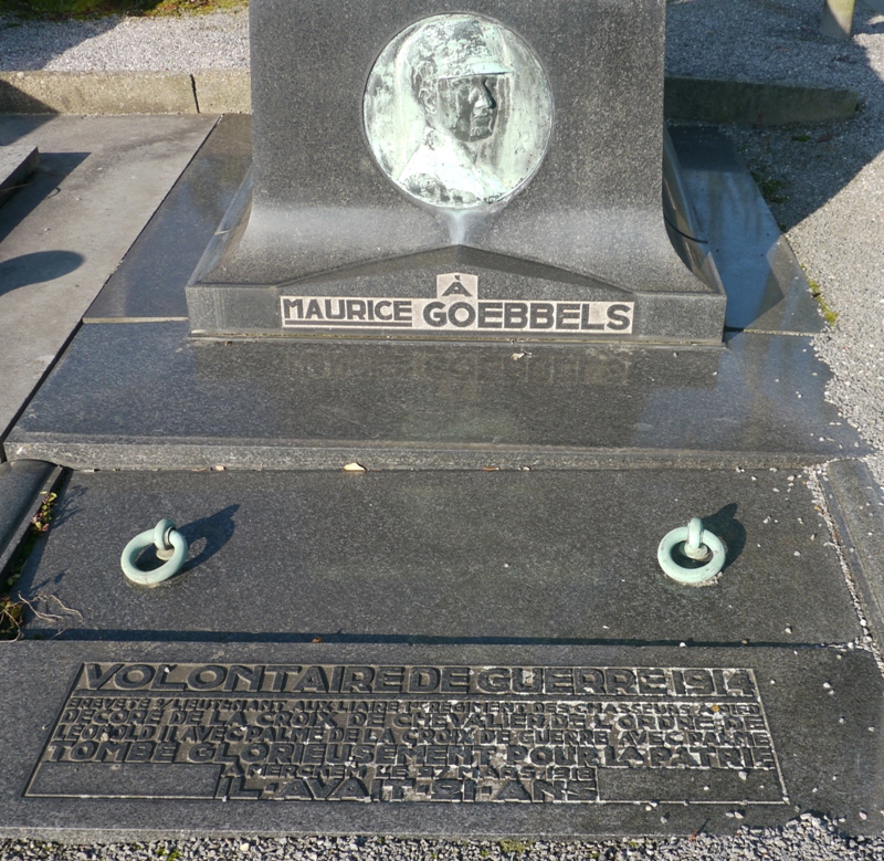 De grafzerk in zwarte graniet, uitgevoerd door aannemer Emile BEERNAERT uit Elsene, bevat vooraan een ronde portretmedaillon van de gesneuvelde jongeman. Op de tombe ligt een stervende militair met de lippen aan de nationale driekleur. De bronzen portretmedallion en het monumentale beeld zijn van de hand van Geo VERBANCK (Bron: Site gewijd aan Geo VERBANCK).